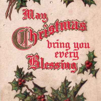 Postcard of holly leaves. The caption reads, ‘May Christmas bring you every Blessing’. The message on the verso reads, ‘Grinnell, Iowa, December 22, 1910, Dear Cousin, A Merry Christmas & a Happy New Year to you all. Orsa Cole, 1103 3rd Ave.’ The card is addressed to James Hattrick, 2113 Manton Street, Philadelphia, Pennsylvania, and is postmarked Grinnell, Iowa, December 22, 1910.Collection
