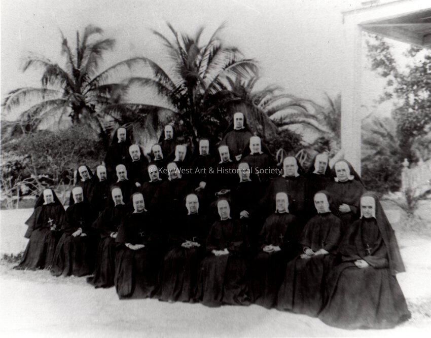 50th anniversary of the Sisters of the Holy Name in Key West.  l-r 1st row-Sisters Mary Lewina, Marie Feliciti, Mary Angelica, Marie Waltrude, Marie Honorine, Sup., Louis Gabriel, Marie Sylvius, Marie Andeol, Isabelle des Anges; 2nd row - Sisters M. Leonidas, Vincent de Sienne, Mary Hermanus, Mary Evangelista, John Anthony, Louis de France, Mary Betilia, Mary Elizabeth, Joseph de Cecile; 3rd row - Sisters Marie Caroline, Marie Niri, Edmund of Jesus, Mary Gerald, Michael Joseph; 4th row - Sisters Henriette de la Providence, Marie Lydia, and Marie Isaic, in 1918.Collection