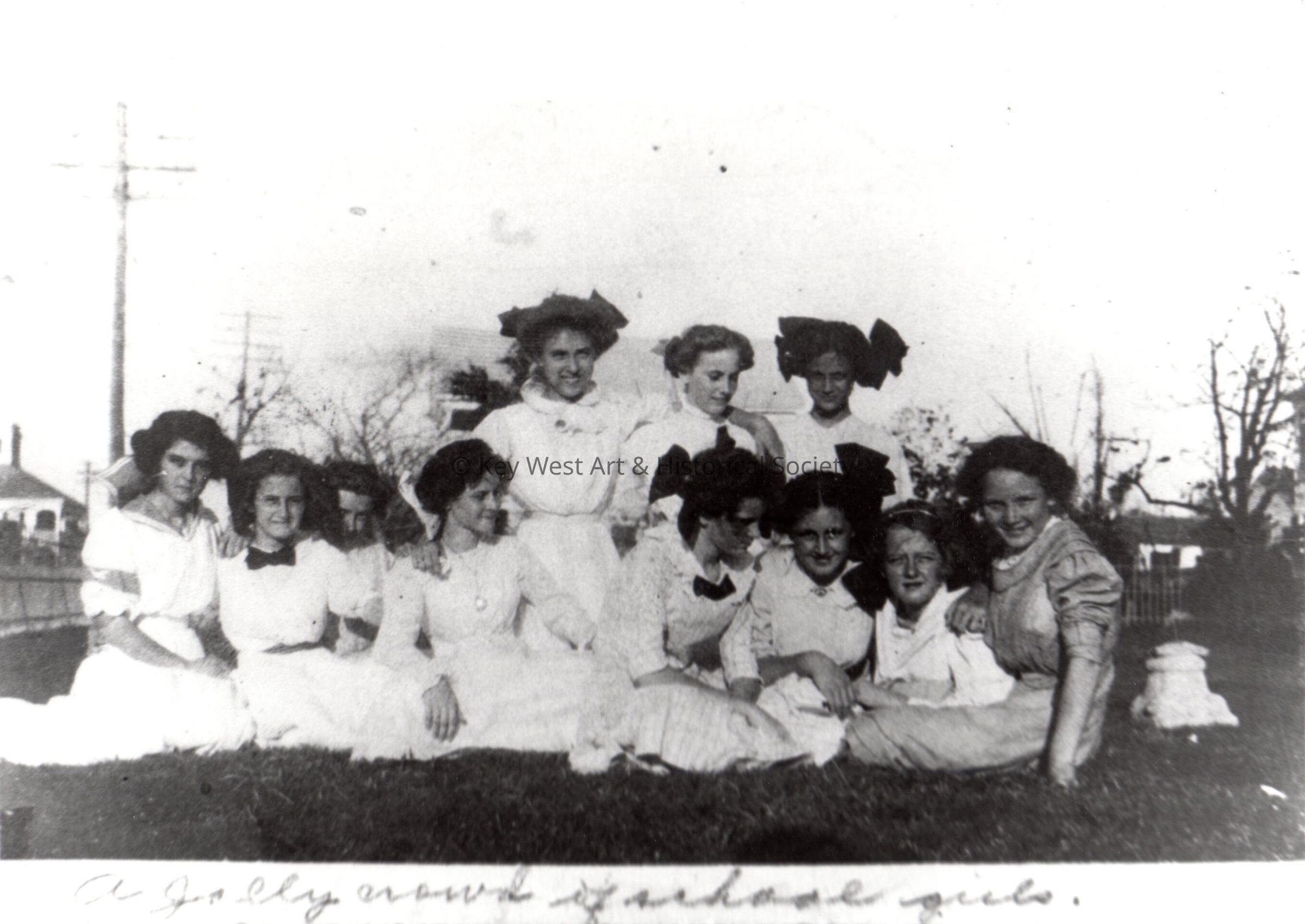 Black and white photograph of a group of school girls who attend the Convent of Mary Immaculate in Key West. Notation on lower edge reads, 'A jolly crowd of school girls.'