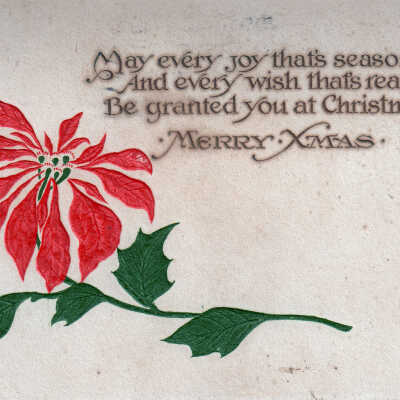 Postcard depicting a poinsettia. The caption reads, ‘May every joy that’s seasonable, And every wish that’s reasonable, Be granted you at Christmastide. Merry Christmas’. The card is signed W. G. Wychoff, 1912. The card is addressed to Mr. John Hattrick, 2113 Manton Street, City, and postmarked Philadelphia, December 22, 1912.Collection