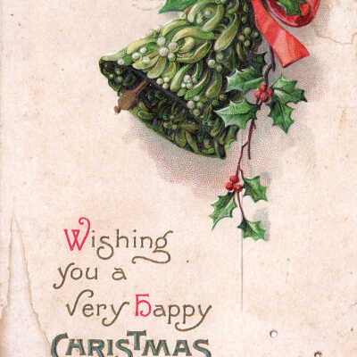 Postcard depicting a bell made of mistletoe adorned with a bow and holly leaves. The caption reads, ‘Wishing you a very happy Christmas’. The message on the verso reads, ‘Wishing you a Merry Christmas and Happy New Year from George and Mamie.’ The card is addressed to Miss L. Scheurer, Key West, Florida, and is postmarked Brooklyn, New York, December 22, 1909.Collection