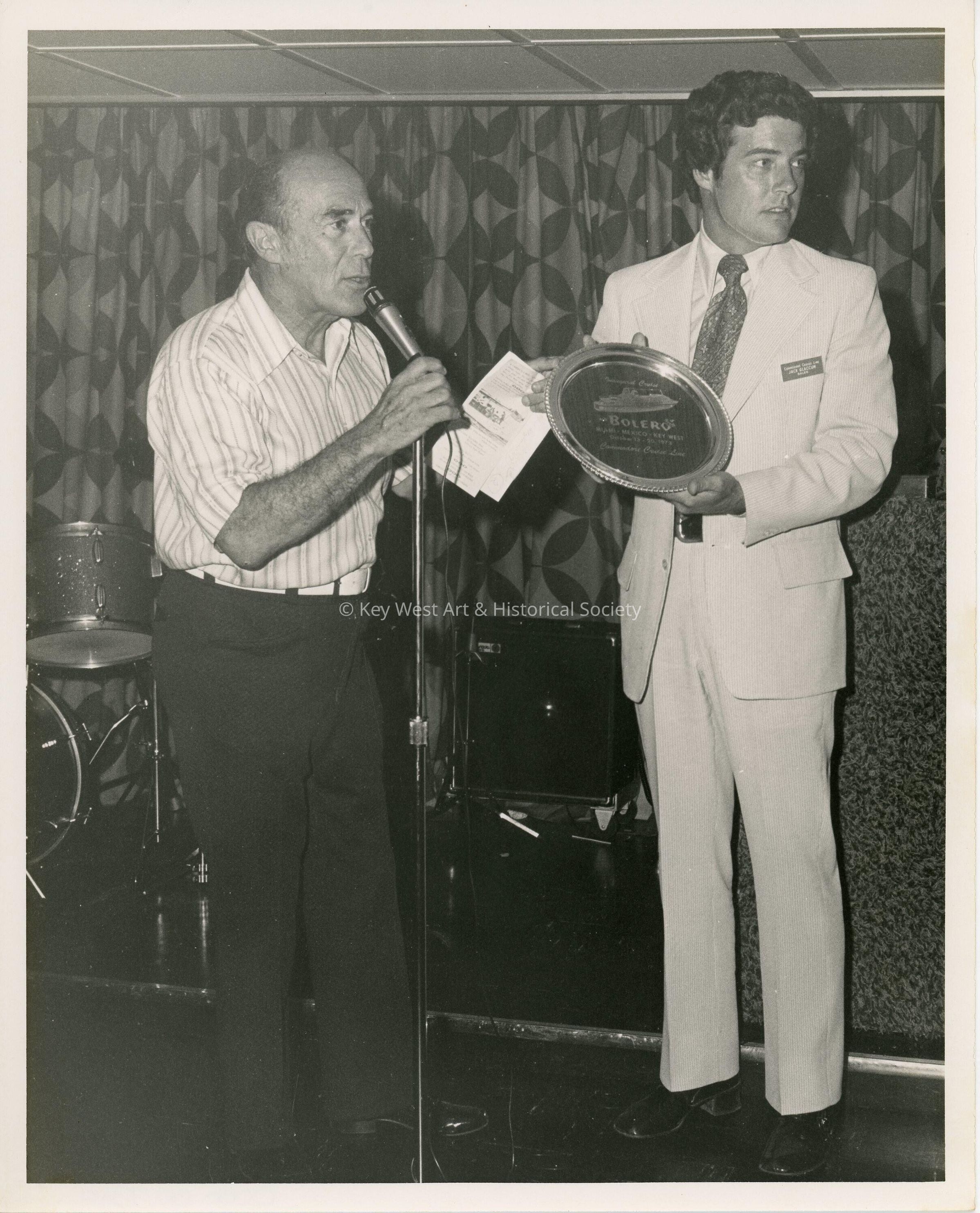 2 Unknown men standing at a microphone, one holding a plaque.Collection