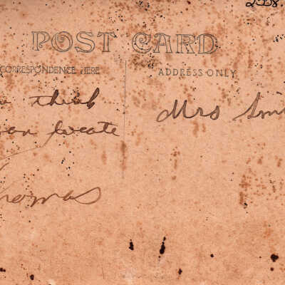 Postcard depicting a group of sailors walking down a city street. The caption reads, ‘Blue Jackets in Rio de Janeiro, Brazil.' A message on the front reads, ‘Where am I?’ The message on the verso reads, ‘Do you think you can locate me. Thomas.’ The card is addressed to Mrs. Smith.Subject Person/Organization