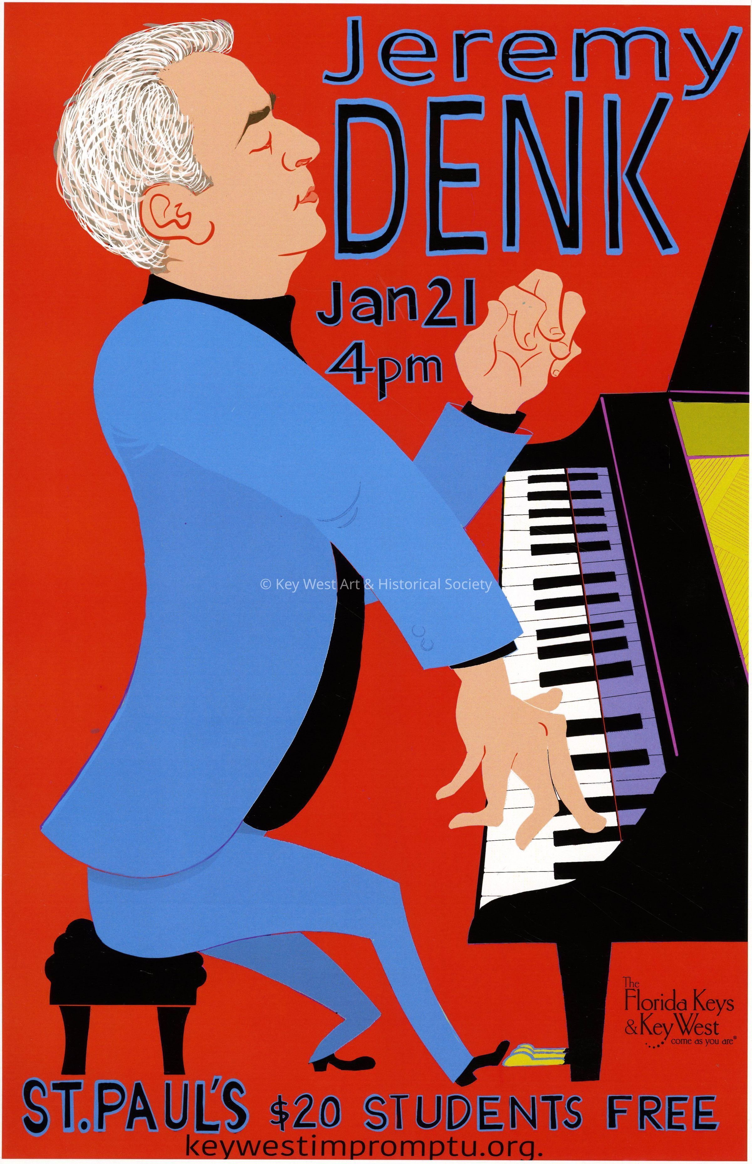 An advertising poster for Impromptu Classical Concerts entitled 'Jeremy Denk'.  The concert took place on January 21, 2024 at St. Paul's Episcopal Church at 401 Duval Street.Collection