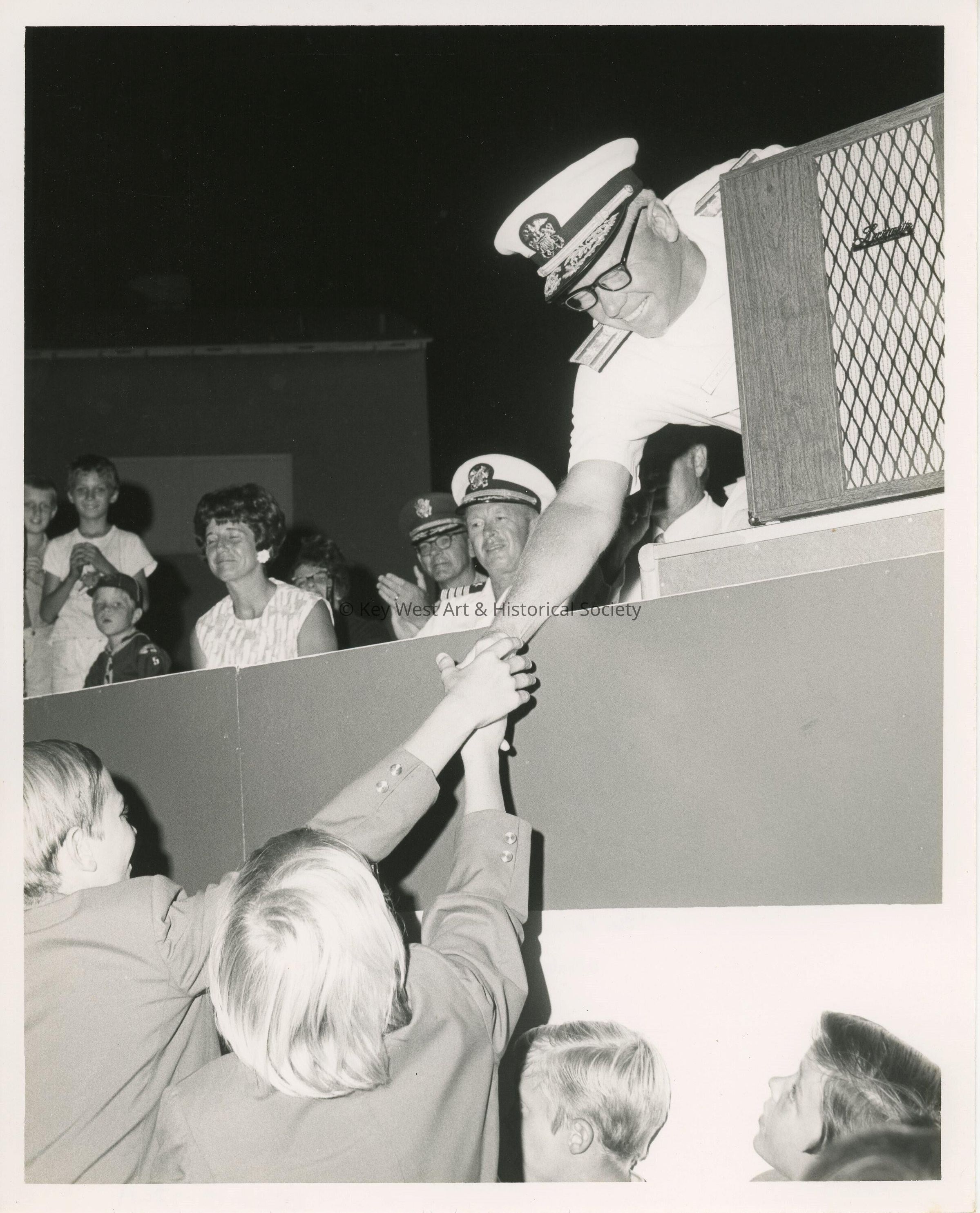 An unknown man at a podium leaning over and shaking handsEntry/Object ID