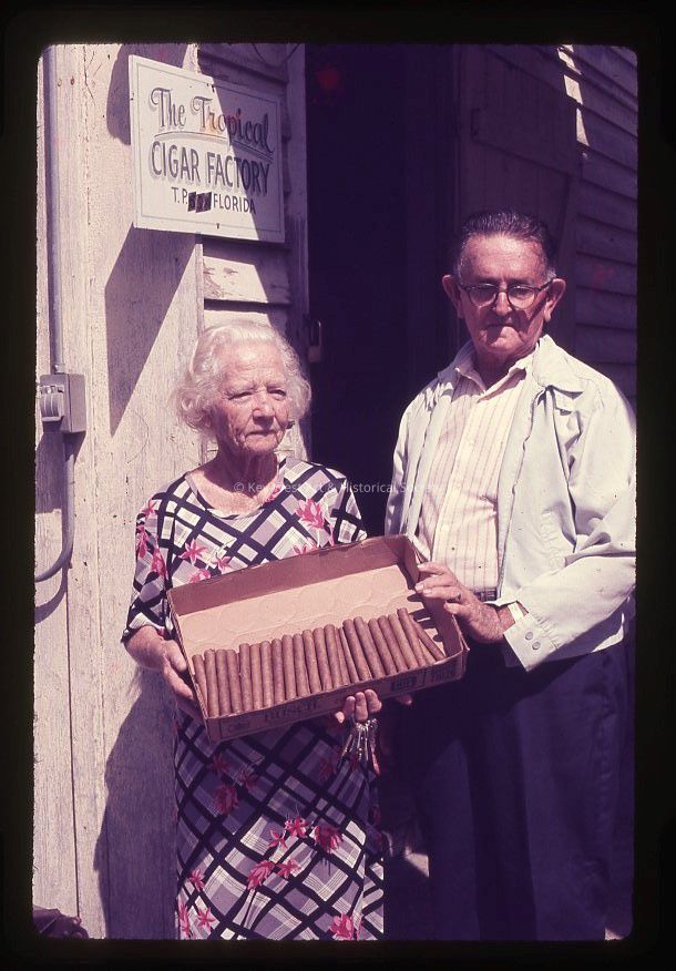 35mm color slide of Willard Bell and his wife Almead Bell standing in front of The Tropical Cigar Factory. Almead is holding a box of their hand rolled cigars. The factory was formerly located on the corner of Fleming and Margaret streets.