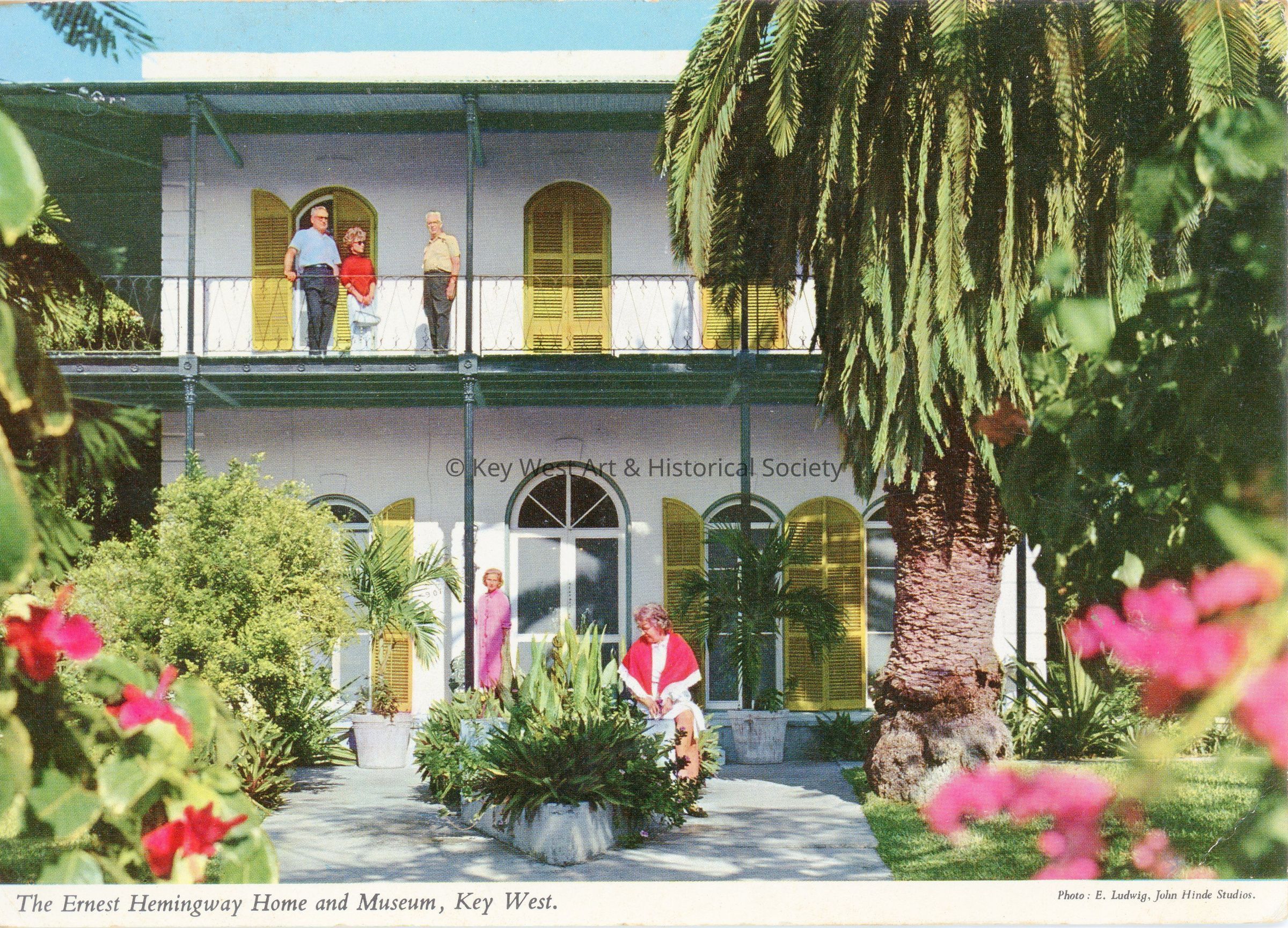 Postcard depicting the Ernest Hemingway Home and Museum with guests present. Notation on verso reads 'PULITZER PRIZE WINNER ERNEST HEMINGWAY lived in this beautiful Key West Colonial Home during many of his early years of writing. Set in a lush tropical setting of foliage. the home is now open to the public and contains many mementos of the famous author at 909 Whitehead Street.'Subject Place
