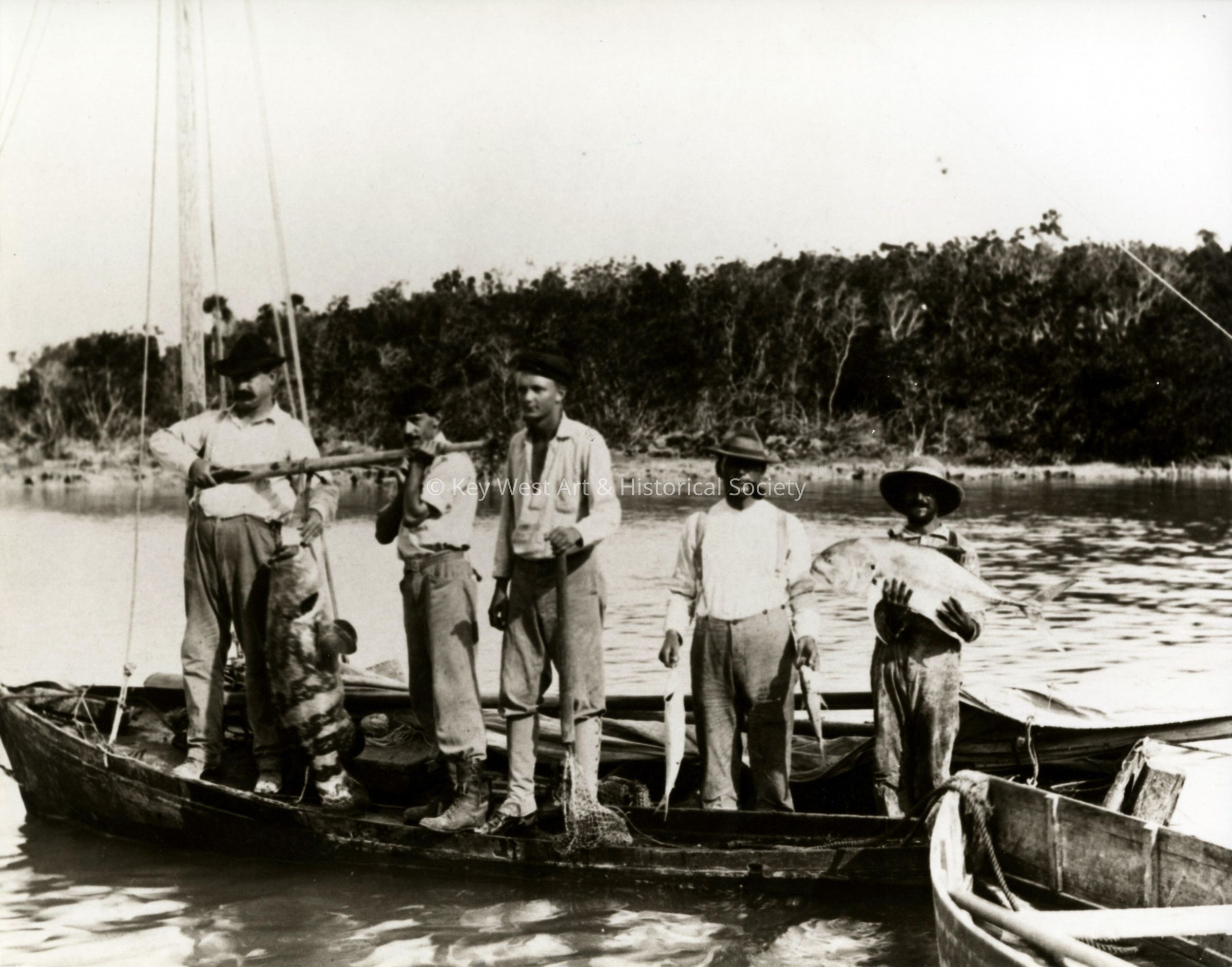 Black and white photograph of a group of unknown men in a skiff holding a selection of fish they caught including a jewfish (goliath grouper).