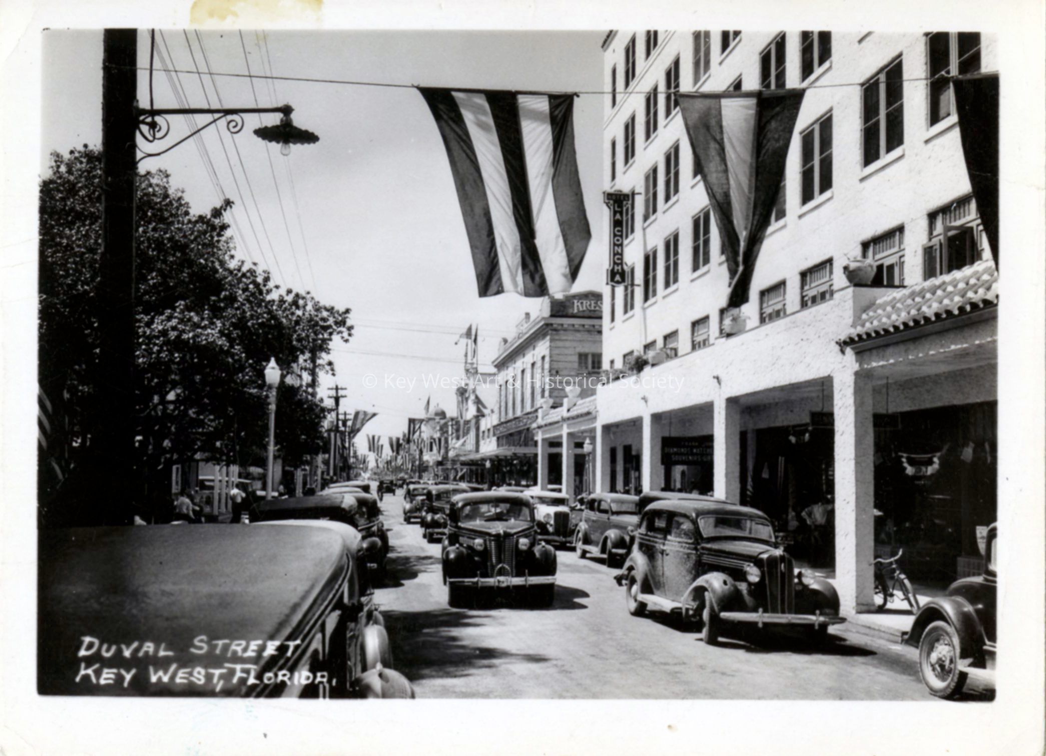 Black and white photograph of the 400 and 500 blocks of Duval Street, looking south. The La Concha Hotel is visible on the right, while the Kress building is in the distance on the right. A series of flags are strewn across Duval Street.Photograph Details