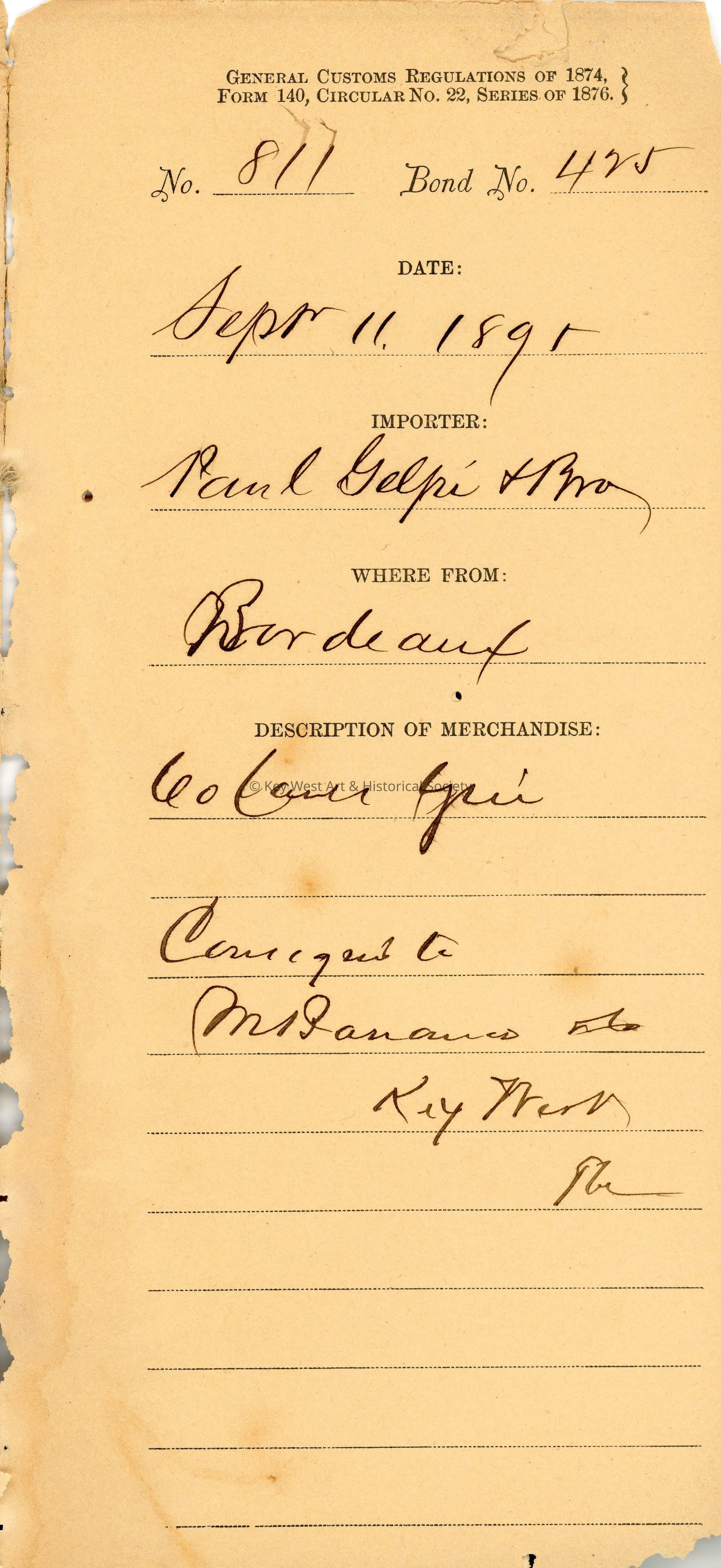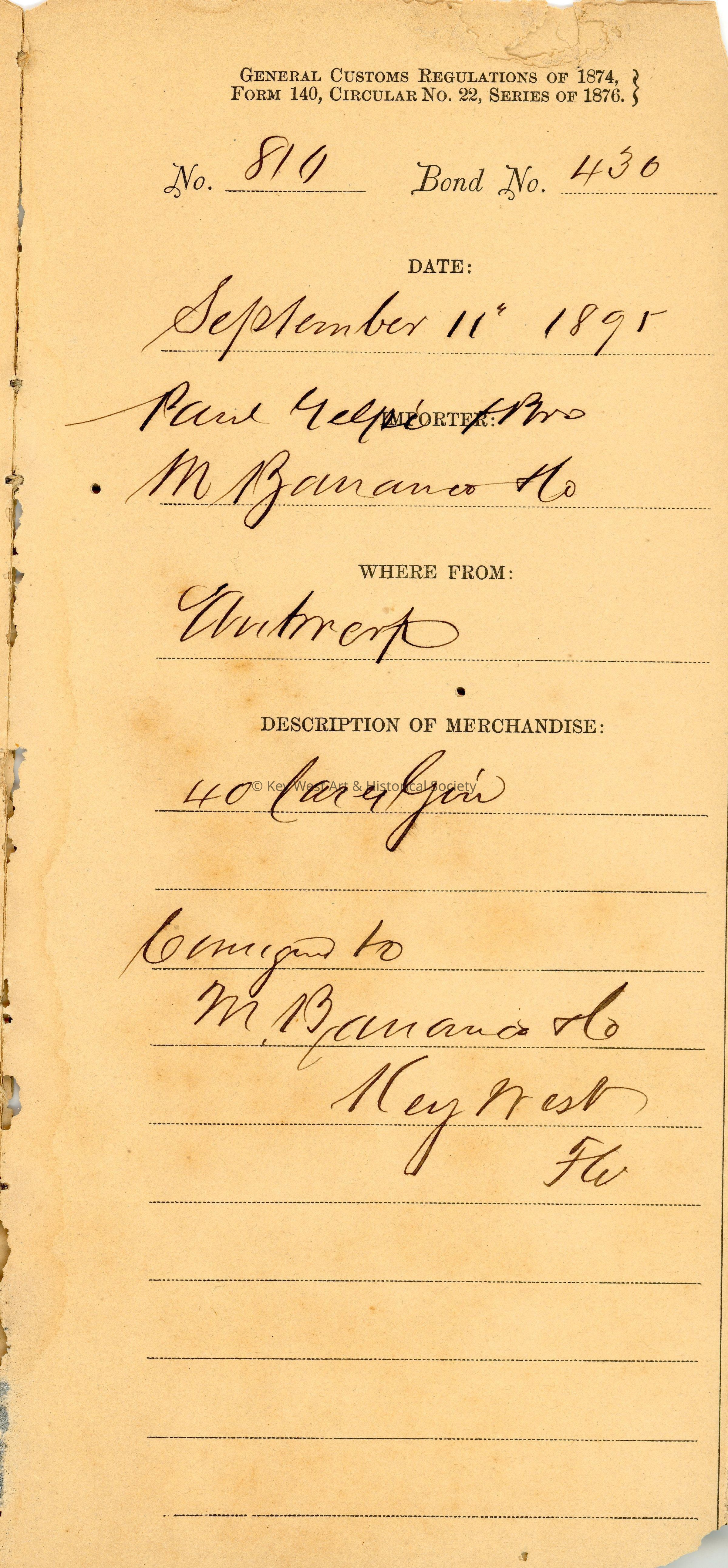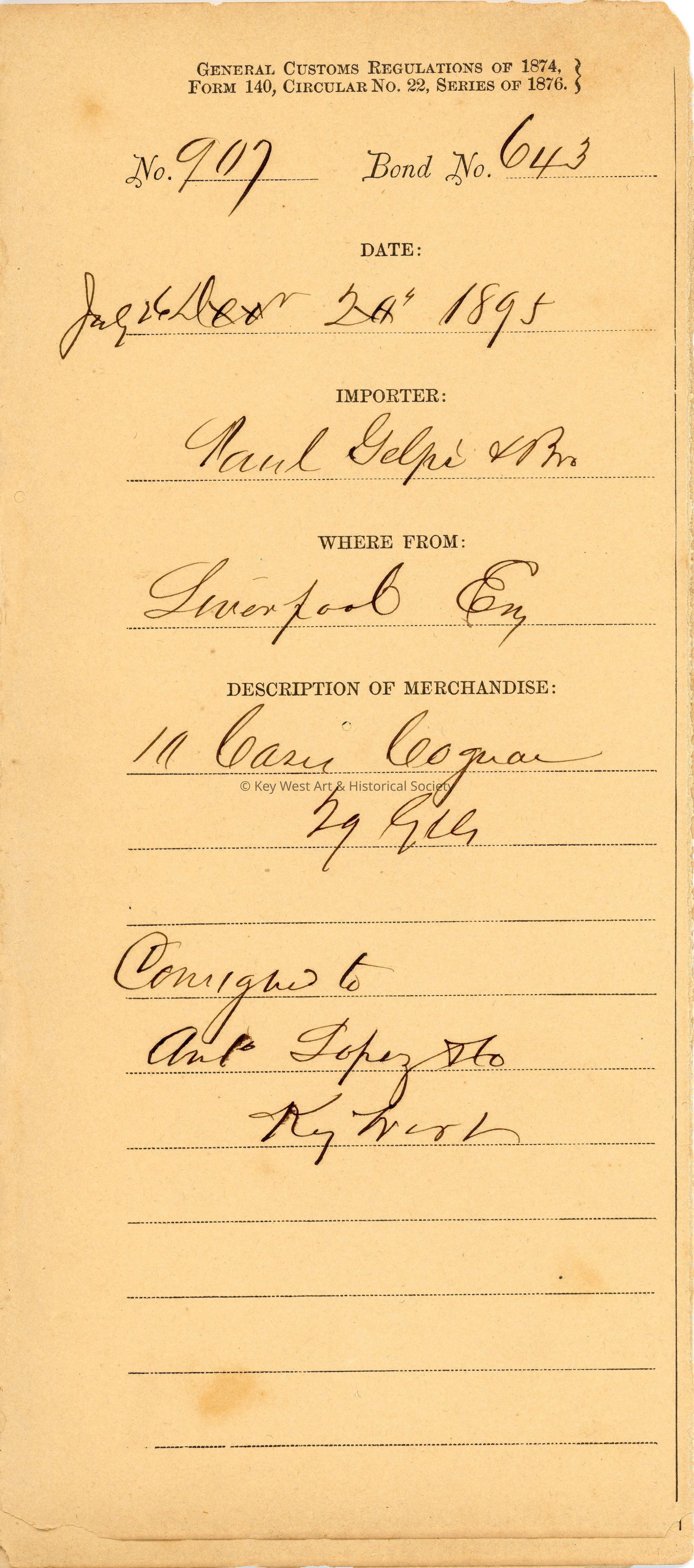 Collection of Customs receipts dated between May 18, 1895 and September 26, 1895 for goods arriving in Key West. Imports included cases of brandy, cognac, and gin and bales of tobacco.Collection