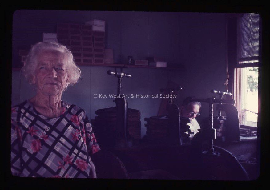 35mm color slide of Almead Bell and her husband Willard Bell in The Tropical Cigar Factory. Almead is in the foreground with Willard in the background sitting at his worktable. The factory was located at the corner of Fleming and Margaret streets.