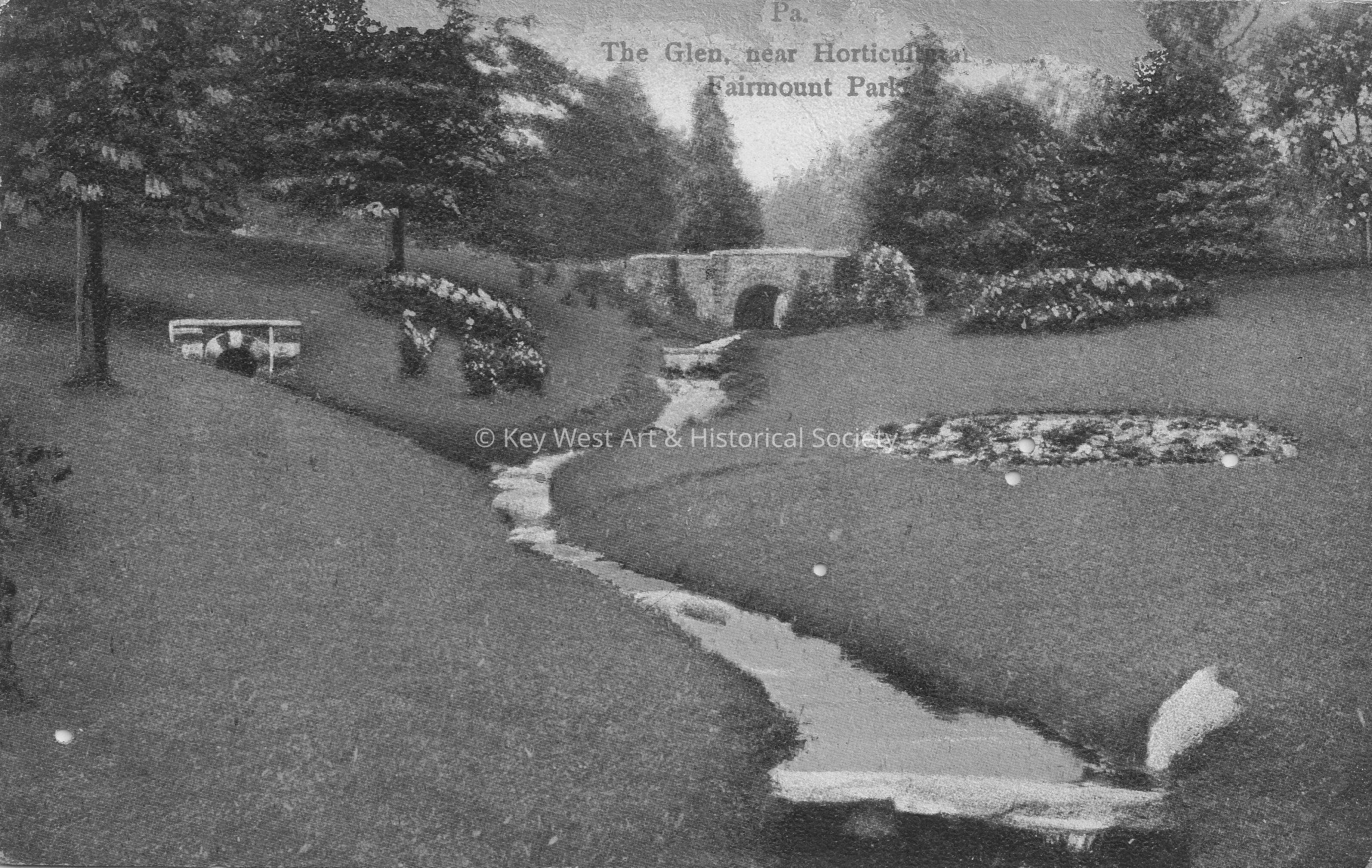 Postcard depicting a creek flowing through a meadow and under a stone bridge.  The caption reads, ‘The Glen, near Horticultural Fairmount Park, Pennsylvania.’Collection