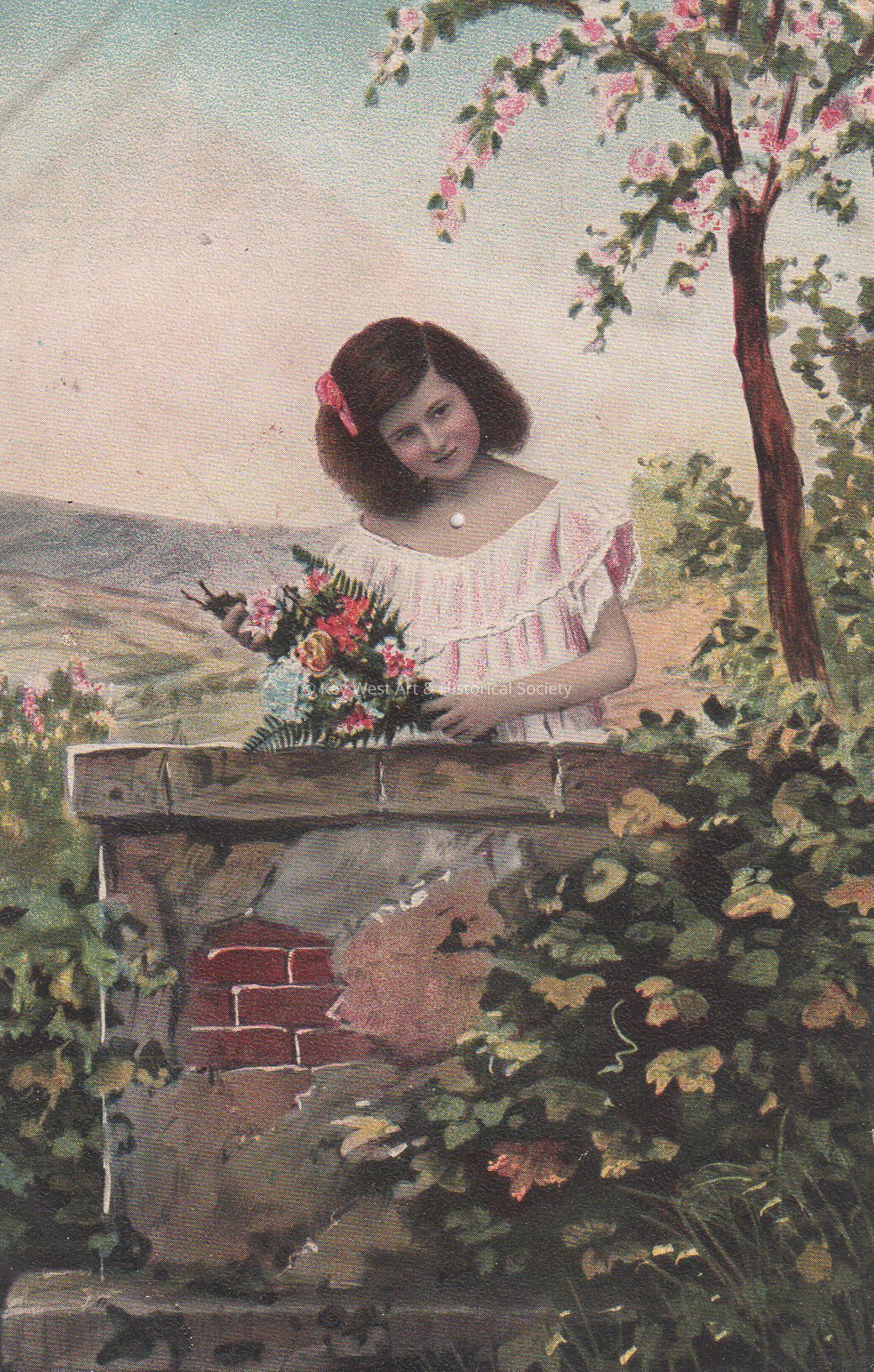 Postcard depicting a young girl with flowers near a brick wall and a flowering tree.