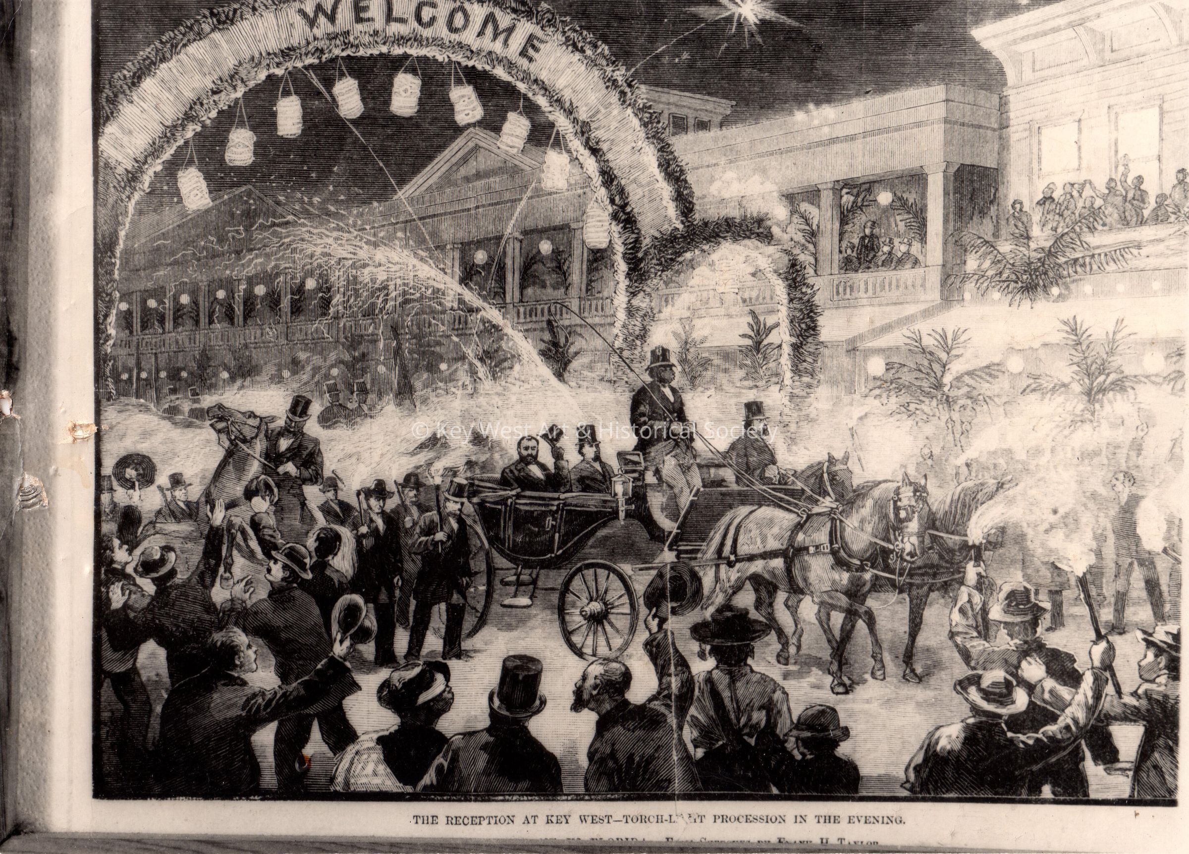 Black and white photograph of former U.S. President Ulysses S. Grant riding in a carriage on Duval Street in front of the Russell House in Key West. Photograph taken from a Harper's Weekly dated February 21, 1880.