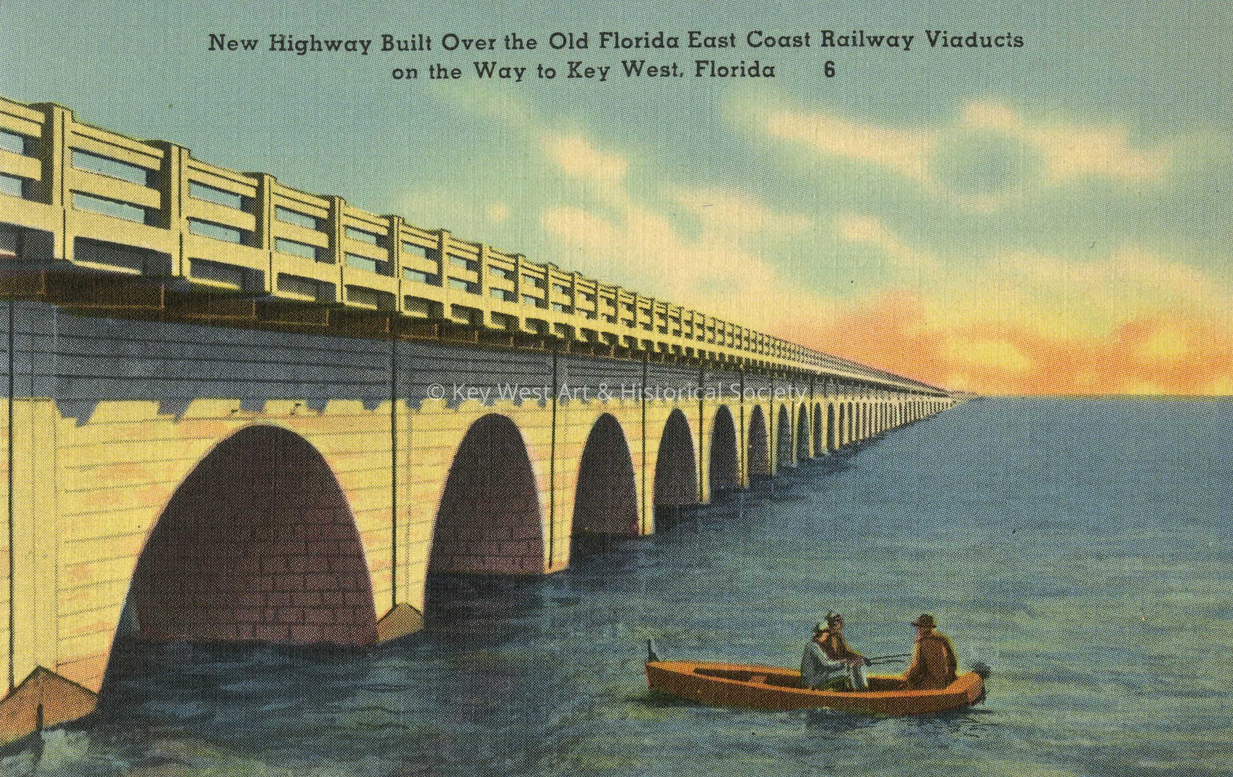 Postcard depicting men fishing from a boat near the Overseas Highway. The caption reads, ‘New Highway Built over the Old Florida East Coast Railway Viaducts on the Way to Key West, Florida.’ Description on verso reads, ‘Built over the old Florida East Coast Railway Viaducts, this engineering marvel, the New Overseas Highway, connects Key West with the mainland, thus eliminating a ferry gap of 20 miles, leaving traffic unimpeded.’Collection