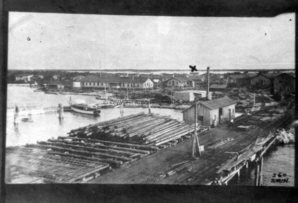 Black and white photograph of Florida East Coast Railway camp and supply depot in Marathon. Buildings include living quarters, the officers' mess, storehouses and the accounting department on the right. The powerhouse and pumping station in the foreground. The 'X' indicates the location of the train station.Photograph Details