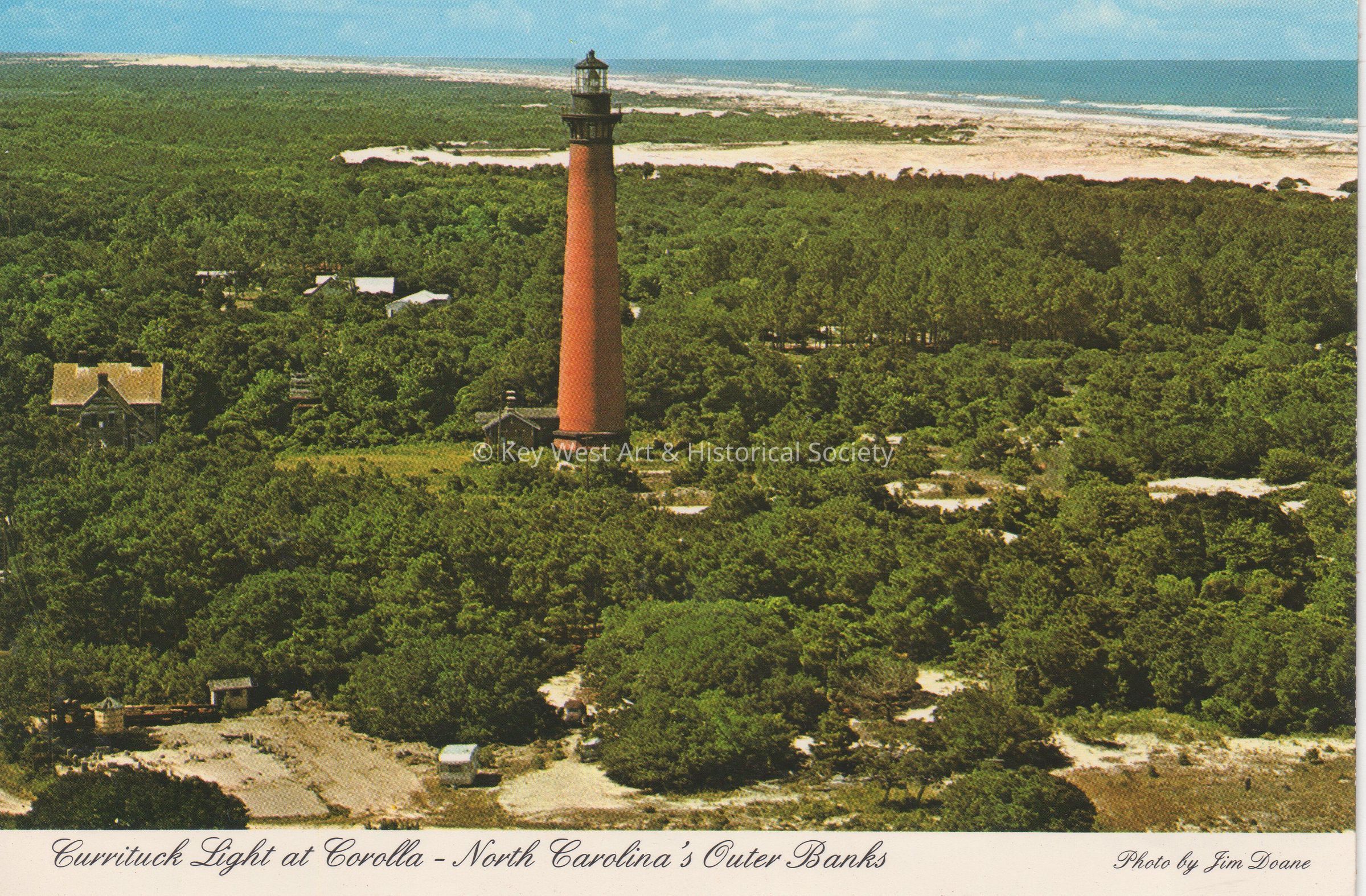 Postcard depicting a lighthouse.  The caption reads, ‘Currituck Light at Corolla – North Carolina’s Outer Banks.'  The description on the verso reads, ‘Since December, 1875 Currituck Light has been guiding mariners to safety along North Carolina’s treacherous shoreline with its nearly 150 ft. high beam.’Subject Place