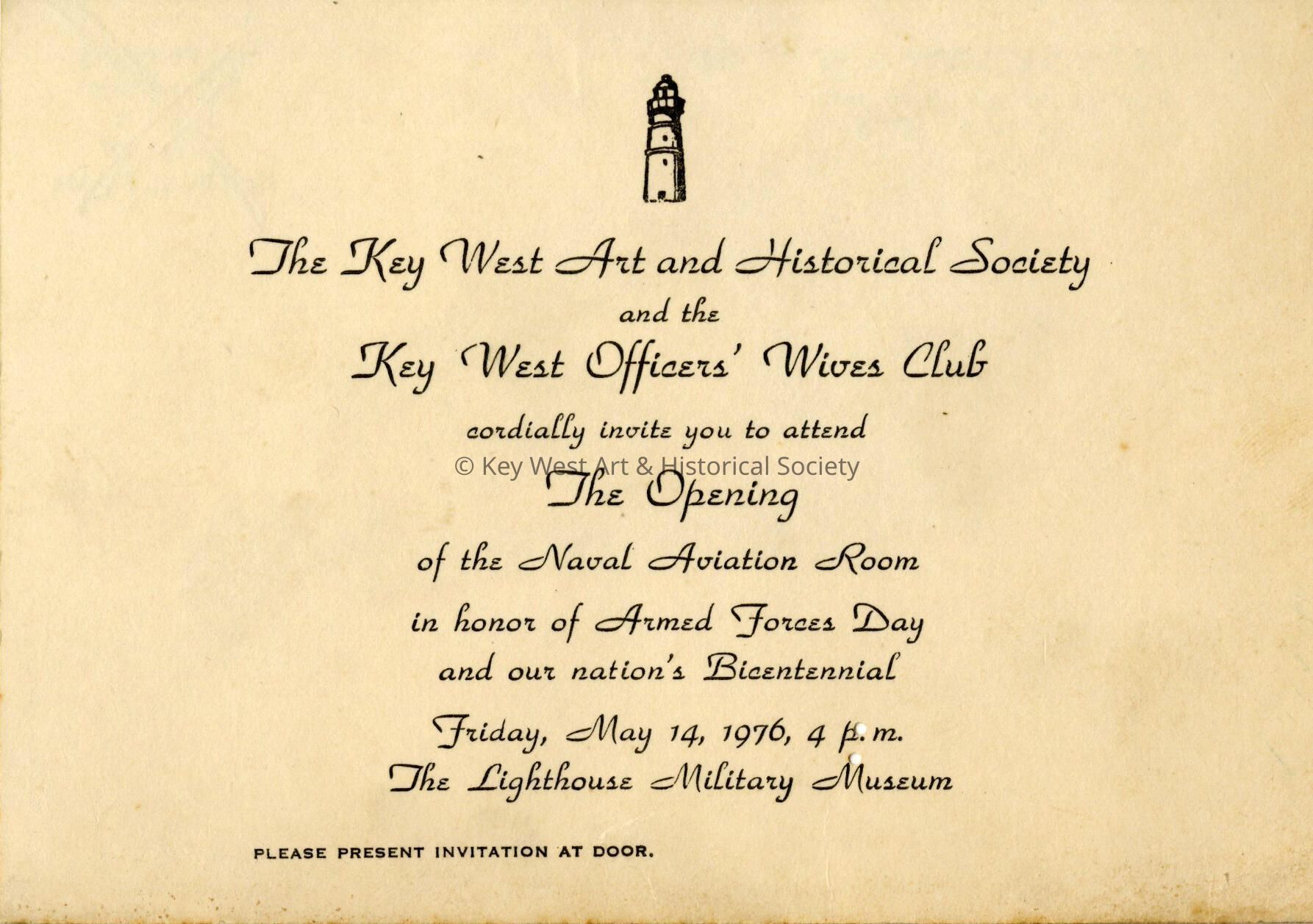 An invitation to the opening of the Naval Aviation Room at the Key West Lighthouse Military Museum in celebration of Armed Forces Week at the United States Bicentennial.