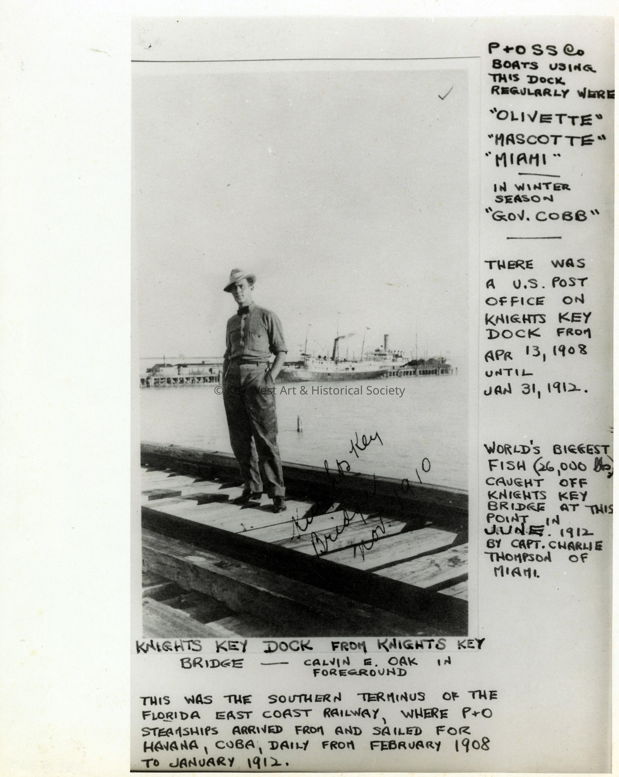 Black and white photograph of Calvin E. Oak standing on Knights Key Bridge.  Caption reads, 'This was the southern terminus of the Florida East Coast Railway, where P&O steamships arrived from and sailed for Havana, Cuba, daily from February 1908 to January 1912.  P&O S.S. Co boats using this dock regularly were OLIVETTE, MASCOTTE, MIAMI, in winter season GOV. COBB.  There was a U.S. Post Office on Knights Key Dock from Apr 13, 1908 until Jan 31, 1912.  World's biggest fish (26,000 lbs) caught off Knights Key Bridge at this point in June 1912 by Capt. Charlie Thompson of Miami.'Photograph Details