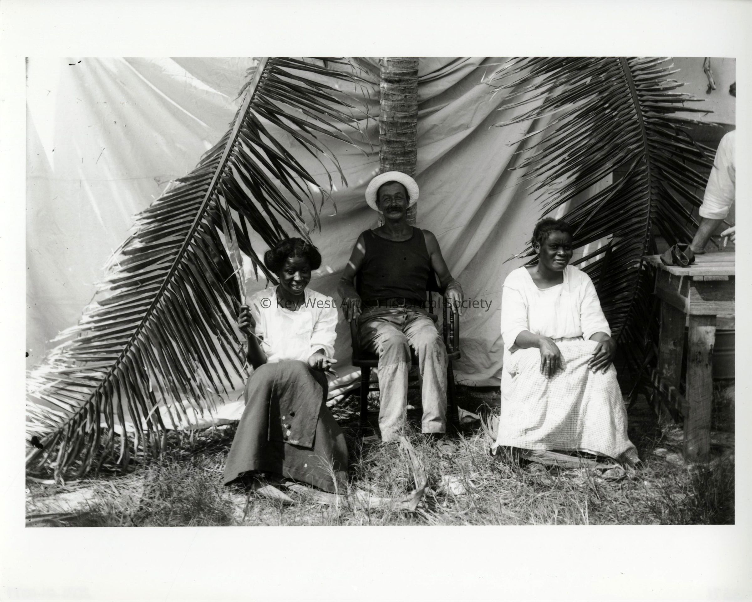 Black and white print taken from a dry plate glass negative of three unknown workers (one man and two women) at the railroad camp on Pigeon Key. The image was taken during the construction of Seven Mile Bridge on the Overseas Railway.