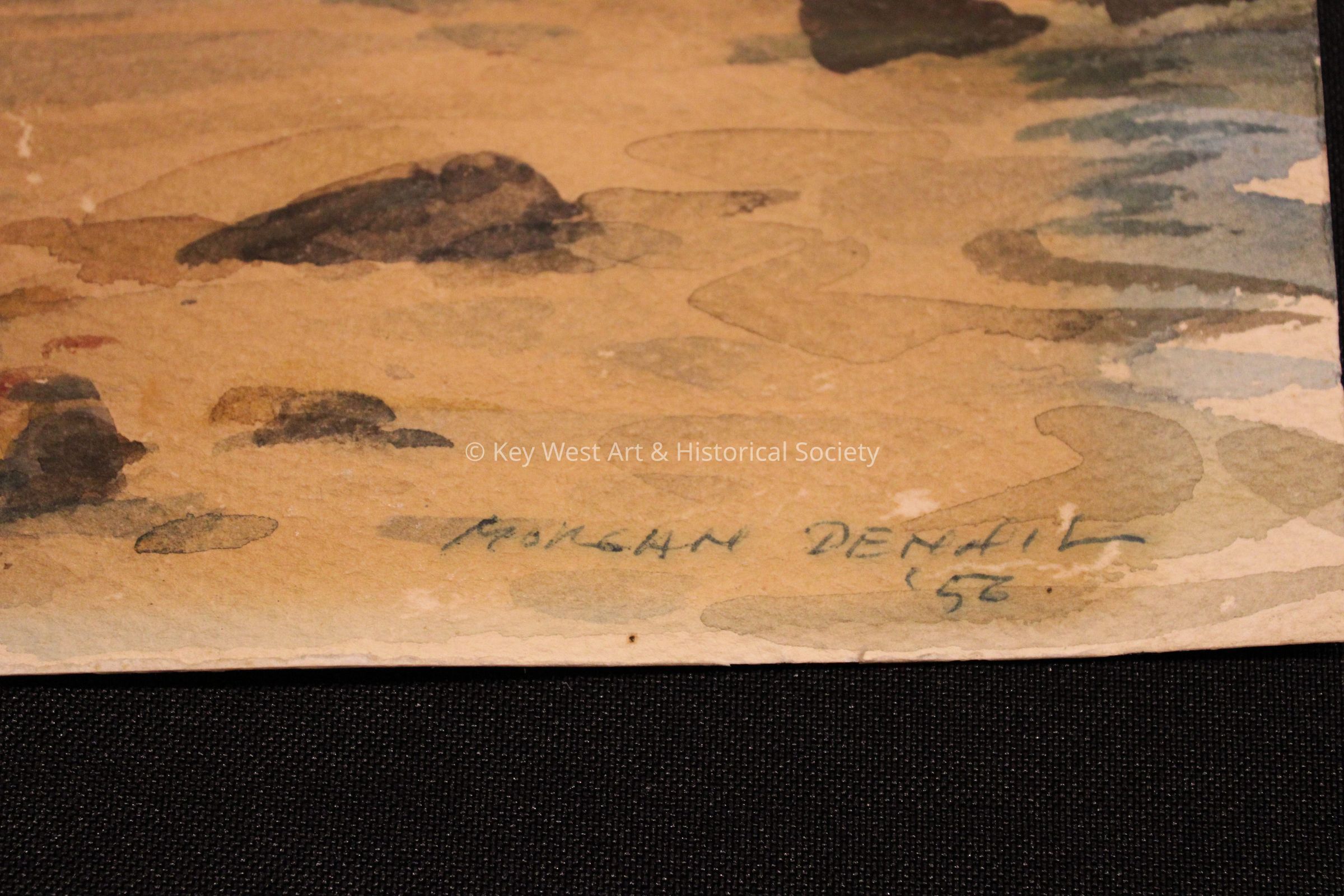Watercolor by Morgan Dennis depicting the foot of Duval Street at the Gulf of Mexico. Shown is a docked boat named BAR PILOT 3 and a sign behind it reading 'Glass Bottom Sight Seeing.'Artwork Details