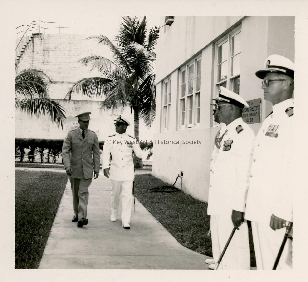 Men in uniform walking, and a few others standing near a building.Collection