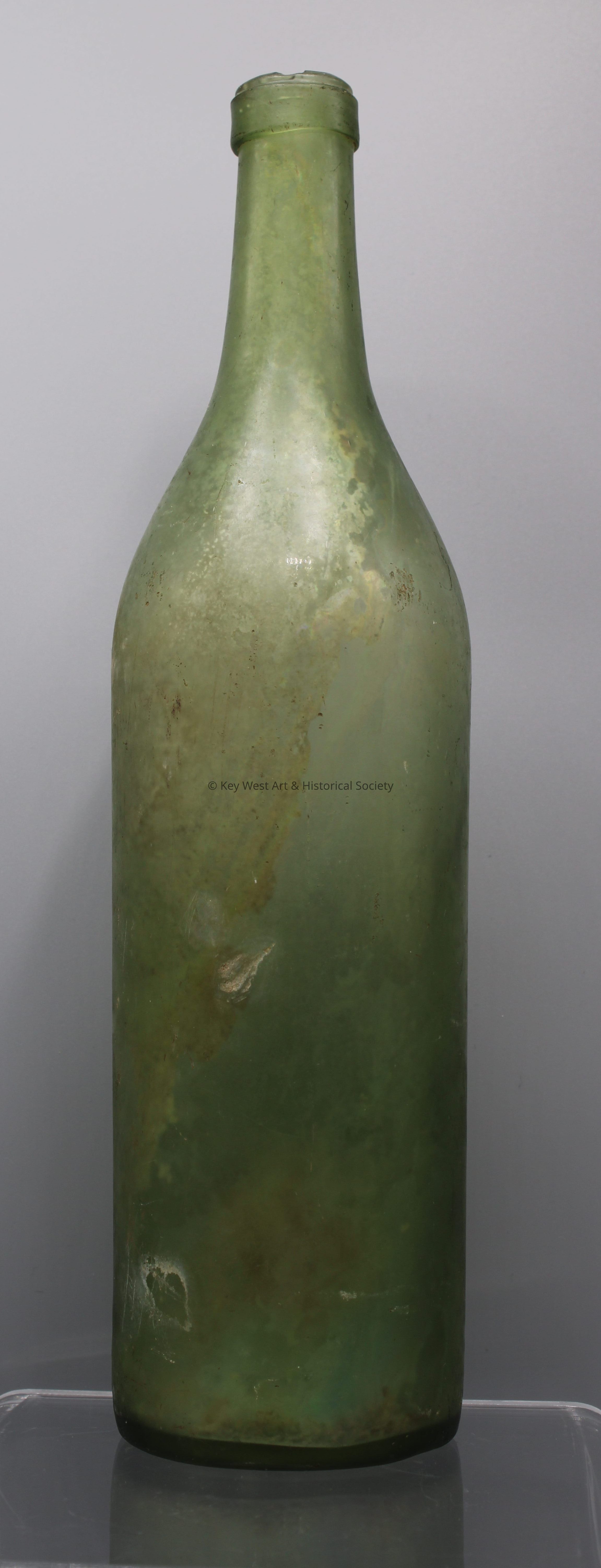 Green glass bottle with a tubular shape with a tapered neck and no markings.