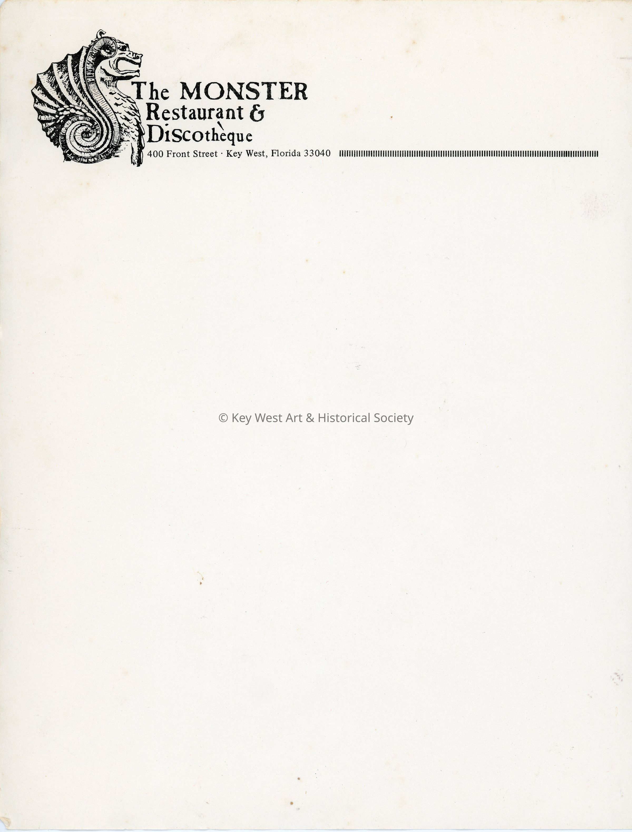 Letterhead for The Monster Restaurant & Discotheque formerly located at 400 Front Street.