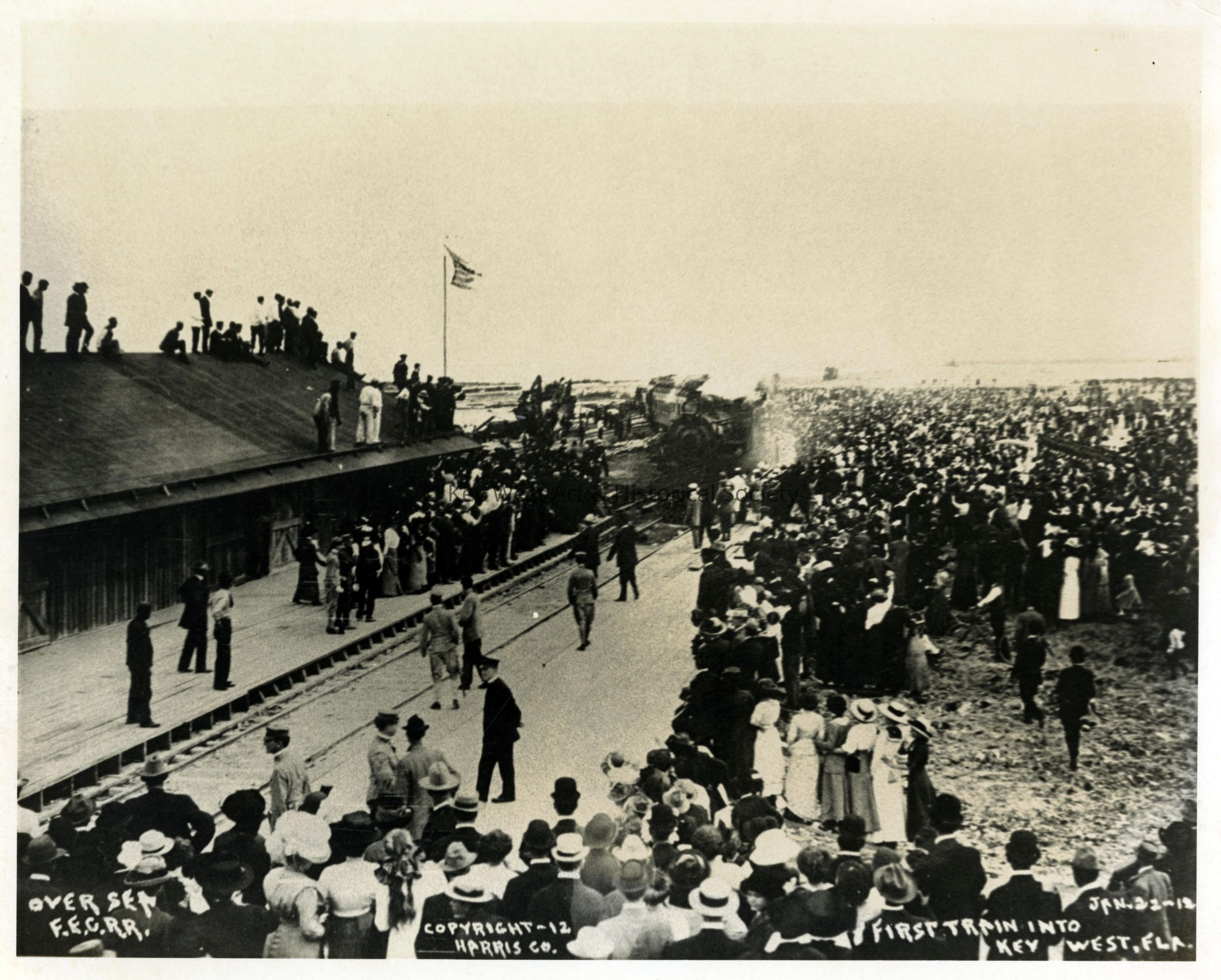 Black and white photograph of a large crowd greeting the first Florida East Coast Railway train as its arriving at the Key West depot.