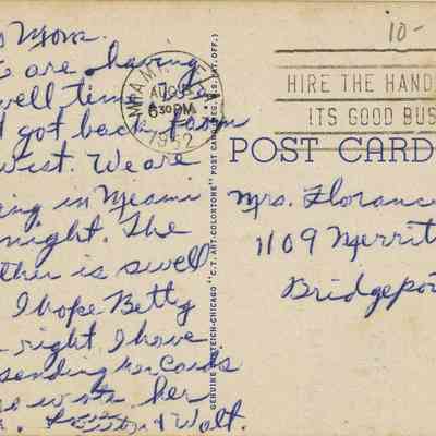 Hello Mom. We are having a swell time. Just got back from Key West. We are staying in Miami to-night. The weather is swell here. I hope Betty is al-right. I have been sending her cards and also wrote her a letter.Dimensions