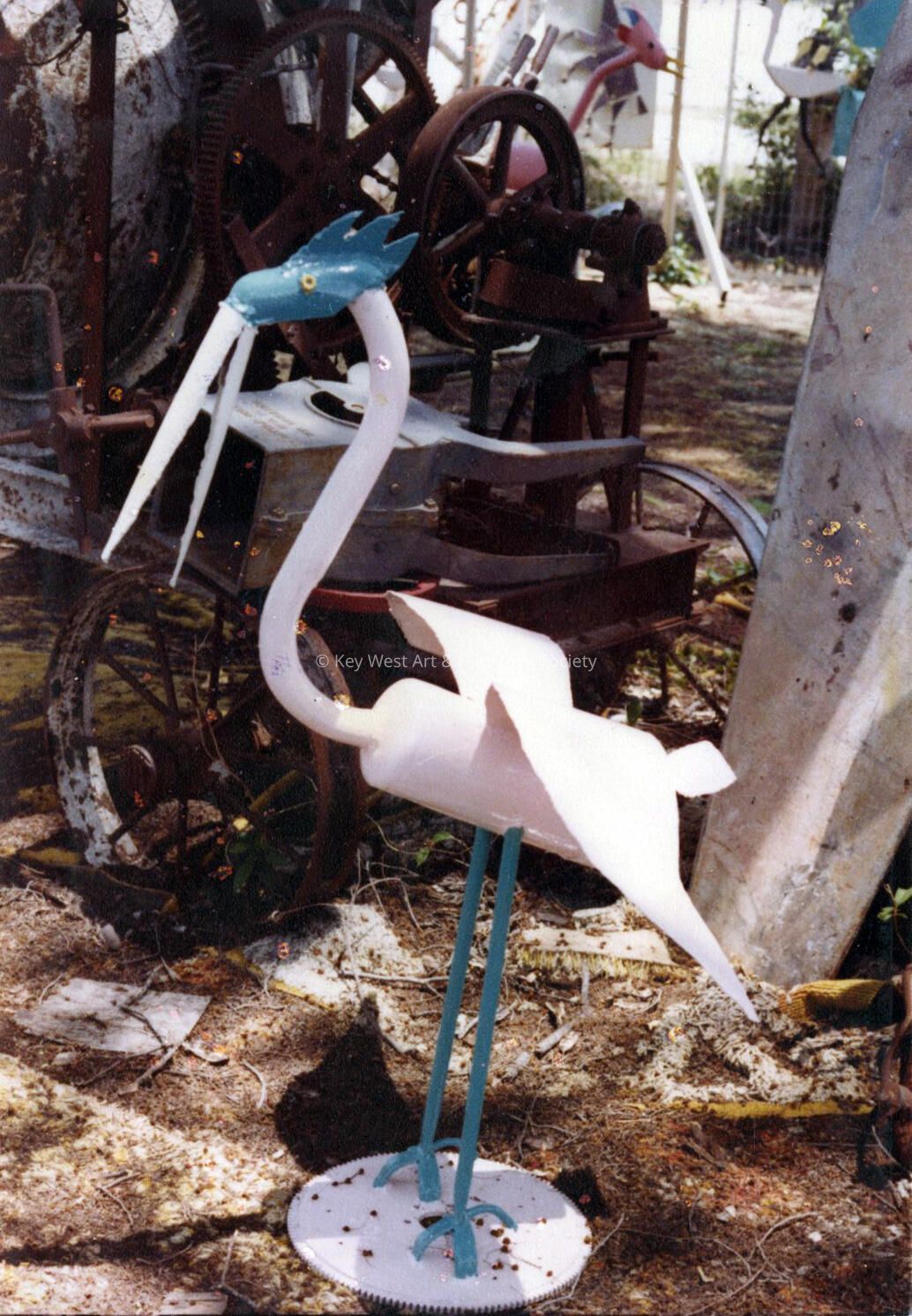 Color photograph of the Stanley Papio's Heron sculpture taken at his Folk Art Museum in Key Largo.