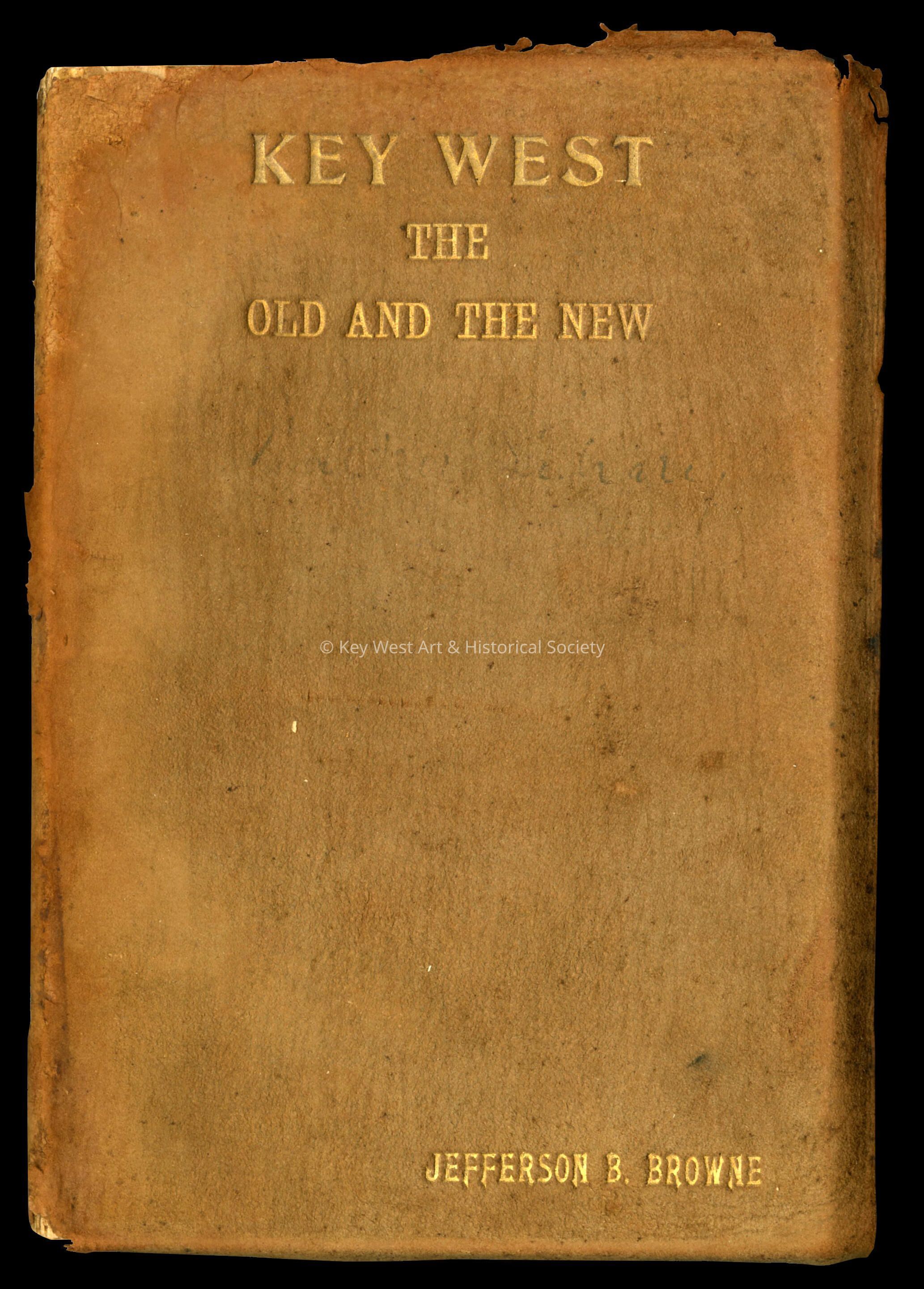 Leather bound history book written by Key West native Jefferson B. Browne.  His description, 'I have written this history of Key West, believing that it would be interesting to the younger generation, and to those who are to come after us, to know something of the people and events which filled the years that have gone.  My first intention was to copy Colonel Maloney's history, published in 1876, and bring it down to the present time.  In collecting the data, however, I found that there were a great many interesting events connected with the early history of Key West which Colonel Maloney had omitted, and concluded that if my work was to be as complete as was possible with available data, I would have to write it anew. This I have done, using, however, such data as his history contains, and at times preserving even his phraseology...'