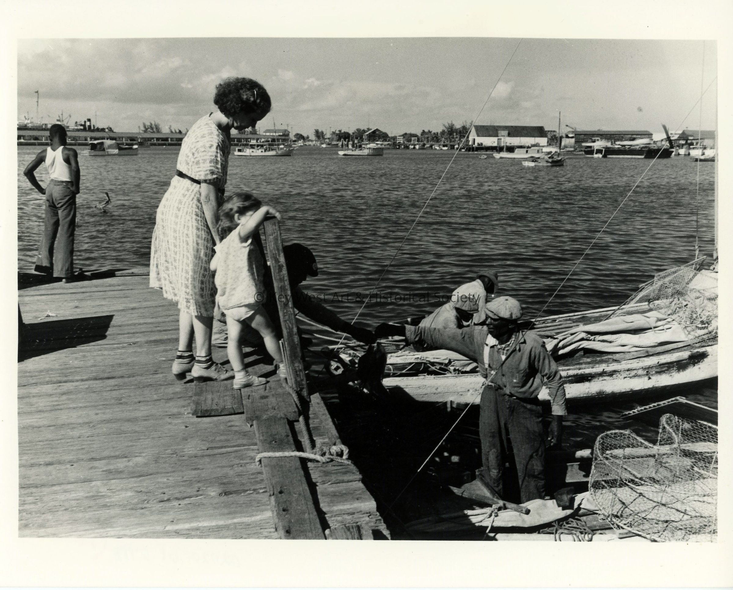 Black and white photograph of an unknown woman and child standing on a dock purchasing fish from a local fisherman.