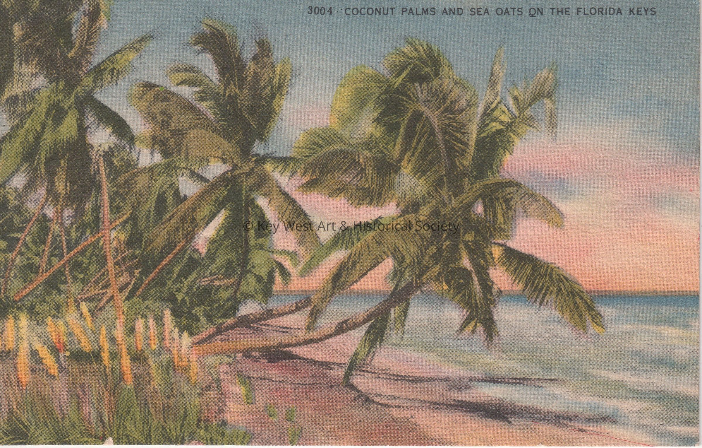 Postcard depicting palm trees on the beach. The caption reads, ‘Coconut Palms and Sea Oats on the Florida Keys’.Subject Place