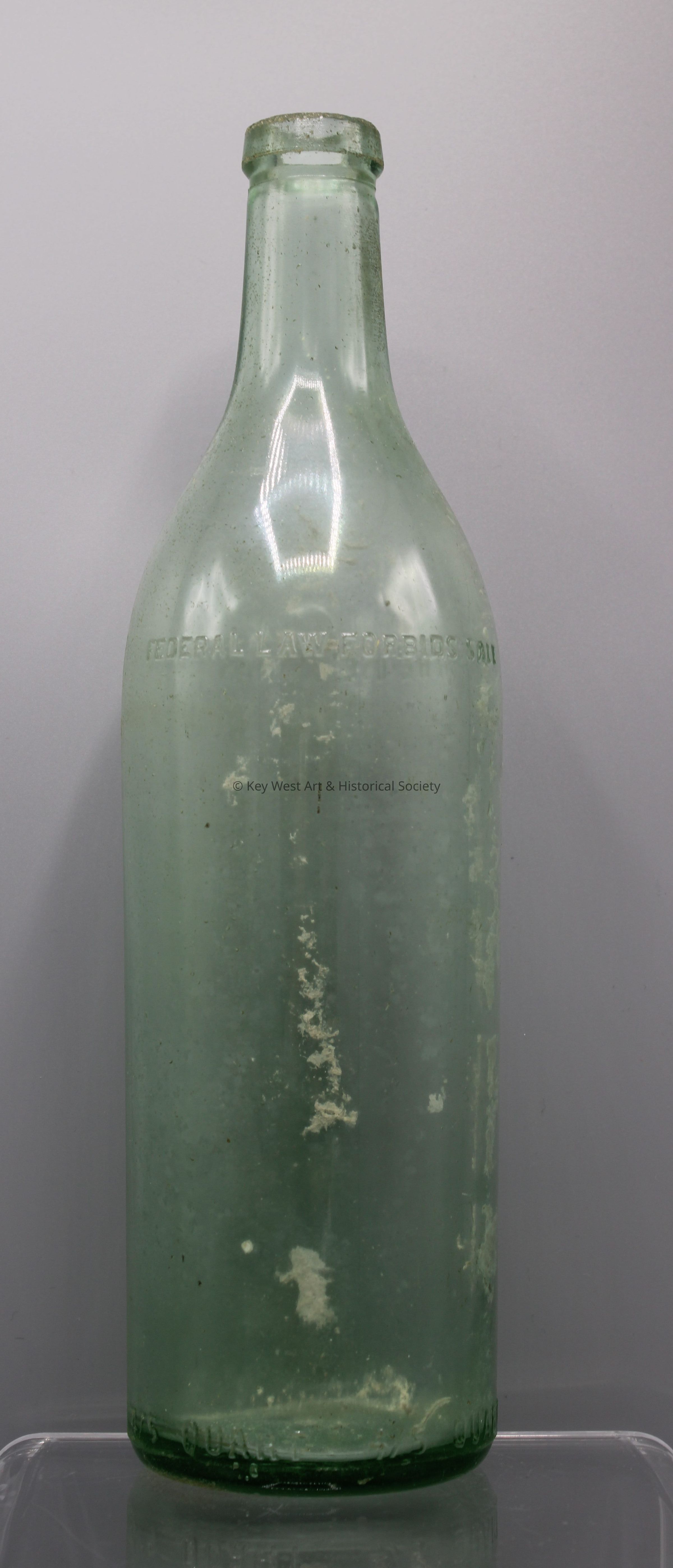 Light blue glass bottle with a tubular shape and 'Federal Law Forbids Sale Or Re-Use Of This Bottle' wrapped around the upper third (1/3) and '4/5 Quart' wrapped around the lower edge. The base of the bottle has 'Bacardi Corp. Of America / San / Juan / P.R. / 65-48' embossed along with a small logo beneath.Use