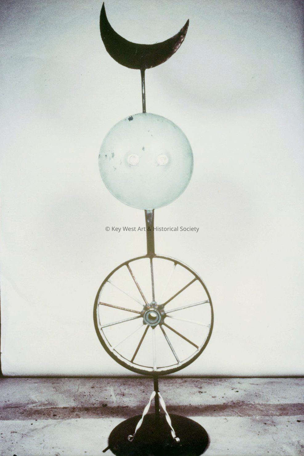 Freestanding sculpture by Stanley Papio in the form of an abstract humanoid figure.  The figure is standing on a circular base and supported by a tripod prop.  The central section of the body is composed of a spoked wheel on top of which a long stem for a neck supports a large disc-shaped head which is surmounted by a crescent moon.Type of Sculpture