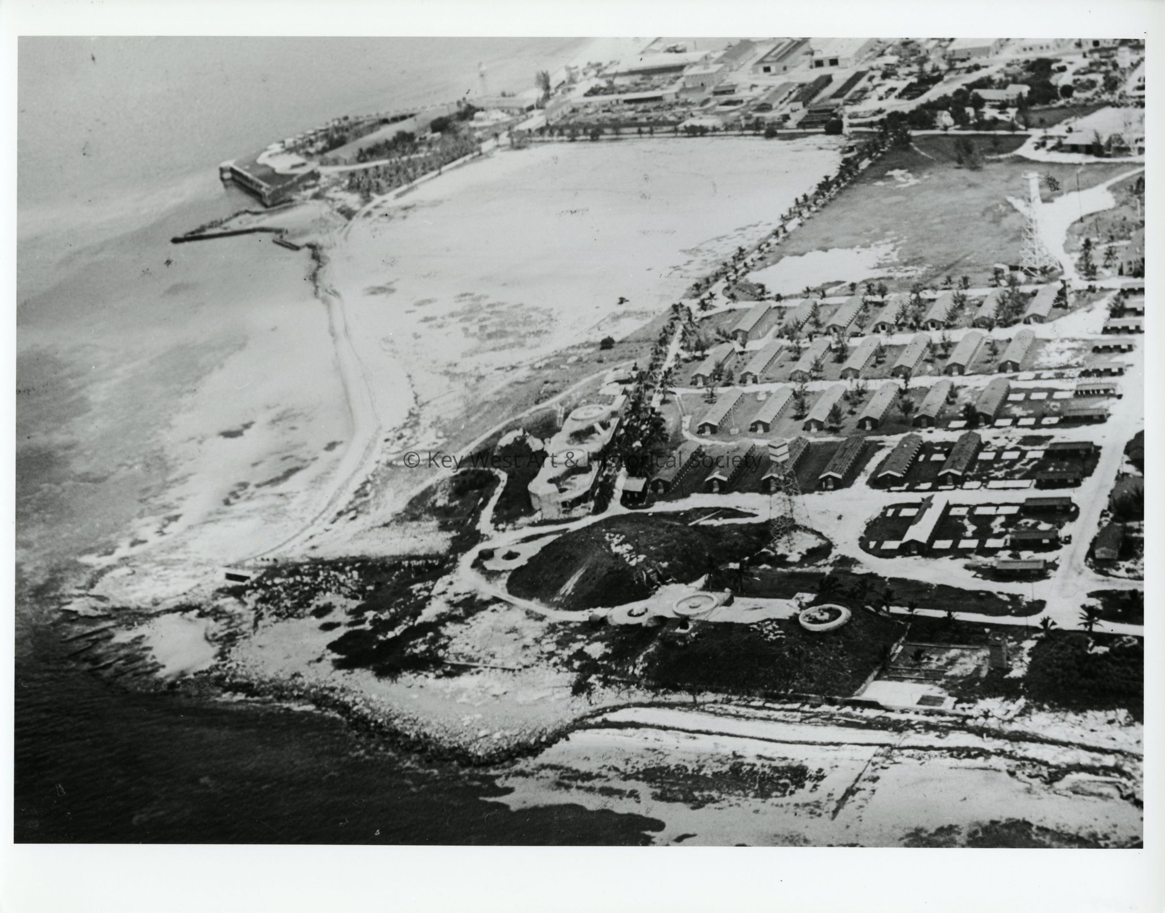 Black and white aerial photograph of Naval Station Key West and Fort Zachary Taylor.