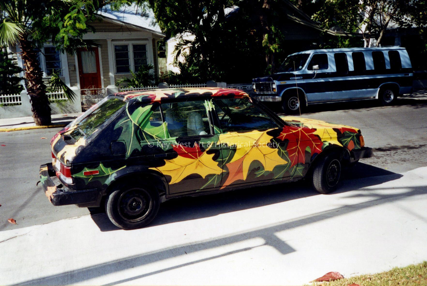Color photograph taken by historian James M. Goode of Carolyn Fuller's 1988 Dodge Omni she named the 'Autumn Mobile' during a trip to Key West in February 2001. The car was parked at the corner of Margaret and Angela streets. It was painted by Rick Worth in 1996. Printed from Roll 1.Photograph Details