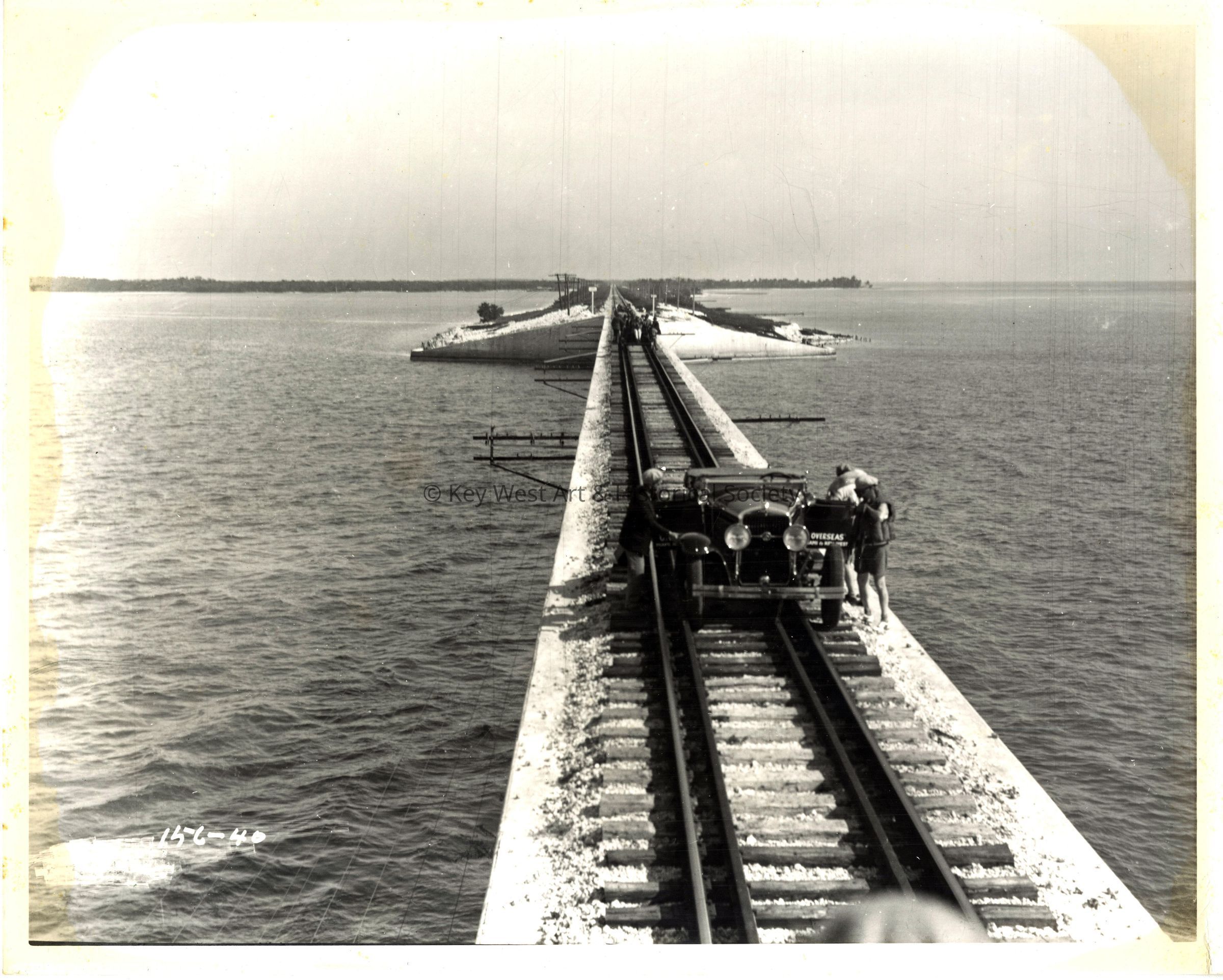 Black and white photograph of an automobile on Long Key Bridge railroad tracks staged as a La Salle publicity stunt.