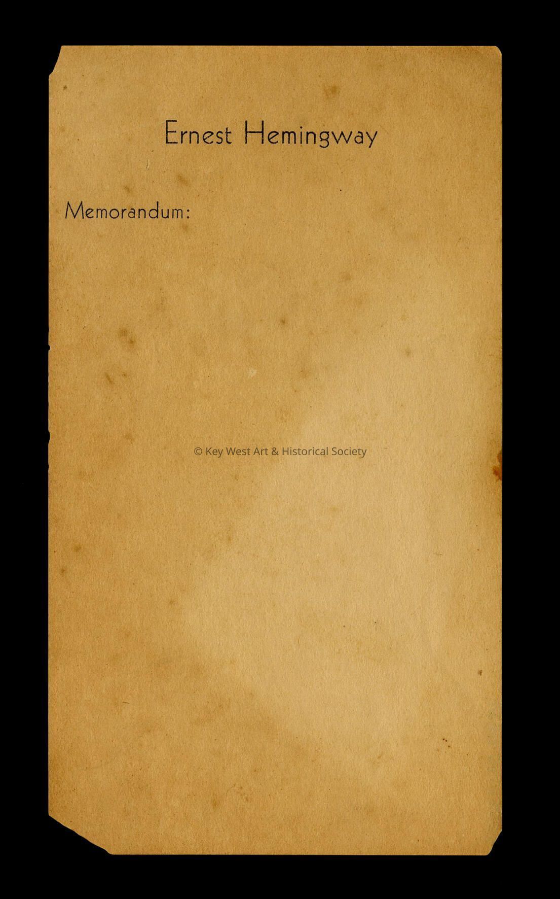 Unused personal memo page belonging to Ernest Hemingway. 'Ernest Hemingway Memorandum' printed on top edge. From the contents of Hemingway's wallet.