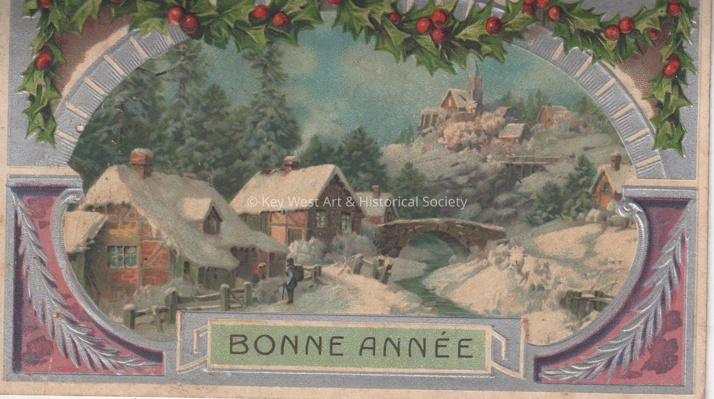 Postcard depicting houses in the snow beneath a garland of holly.  The caption reads, ‘Bonne Annee’.  The message on the verso reads, ‘With best wishes for a Merry Christmas and Happy New Year to you both.  Lovingly, Marguerite’.  The card is addressed to Mr. & Mrs. Pressey L. Weatherford, #507 Whitehead Street, Key West, Florida, and is postmarked Waterloo, December 19, 1910.Collection