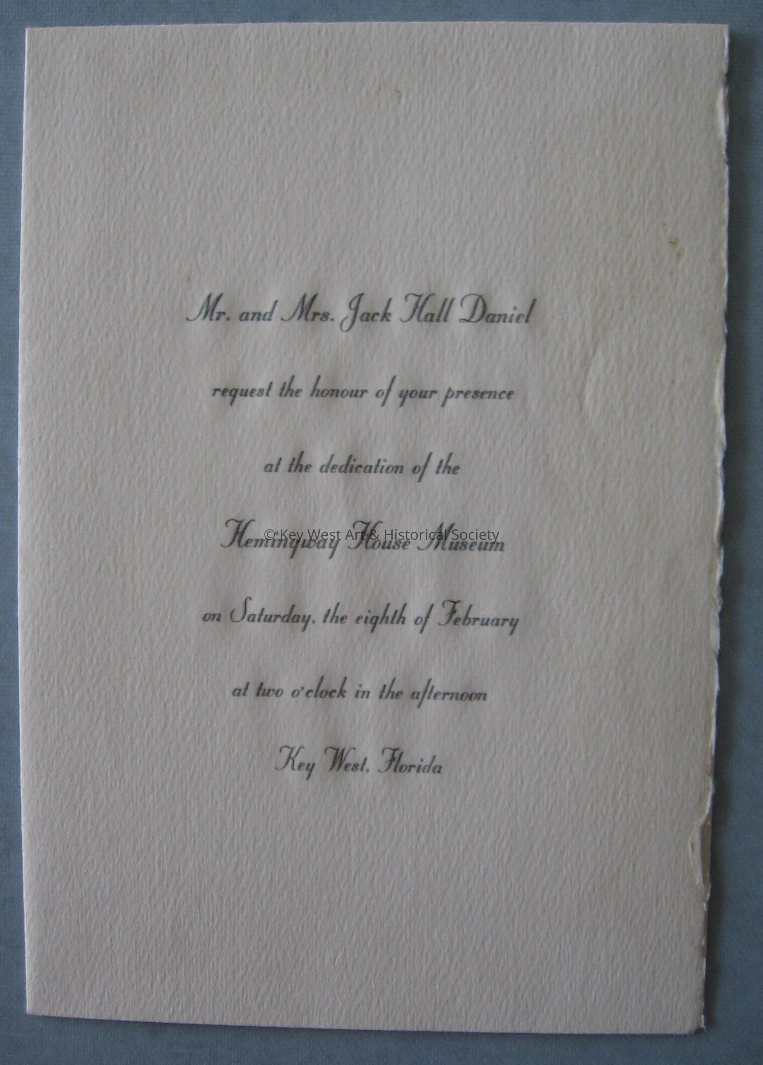 Piece one in a set of three. Invitation to the dedication of the Hemingway House Museum. Invitation was to Rev. and Mrs. John Houck from Mr. and Mrs. Jack Hall Daniel. There is writing on the front and it is blank inside.