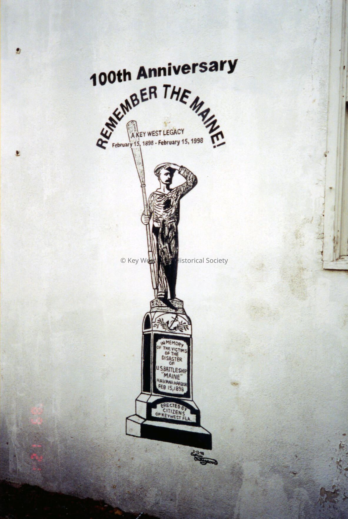 Color photograph taken by historian James M. Goode of a 'Remember the Maine' mural by Captain Outrageous at 225 Elizabeth Street during a trip to Key West in February 2001. Printed from Roll 8.