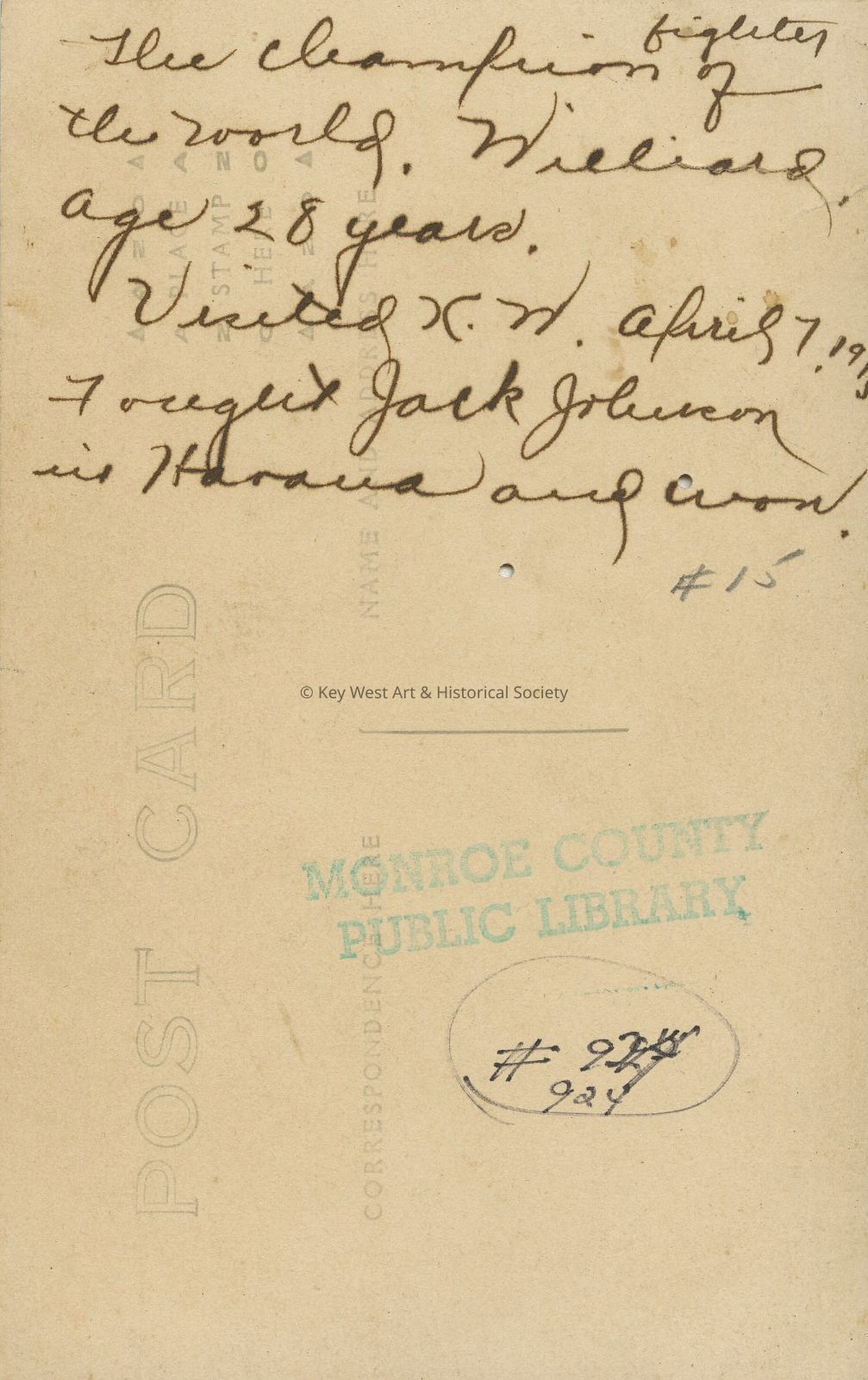 Postcard the champion American boxer Jess Willard who visited Key West on April 7, 1915.