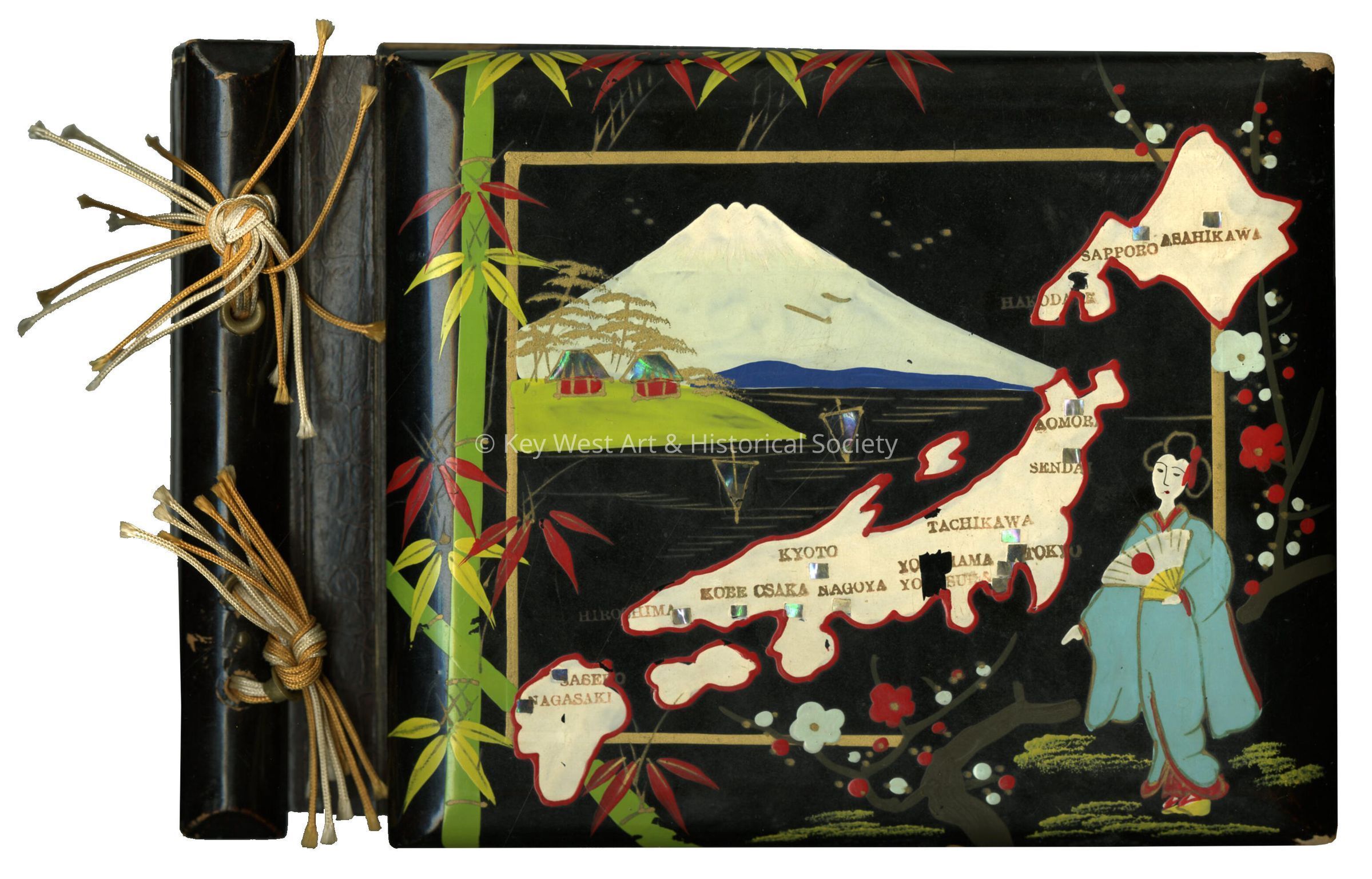 Japanese lacquered photograph album containing black and white photographs during a Florida and Florida Keys vacation.