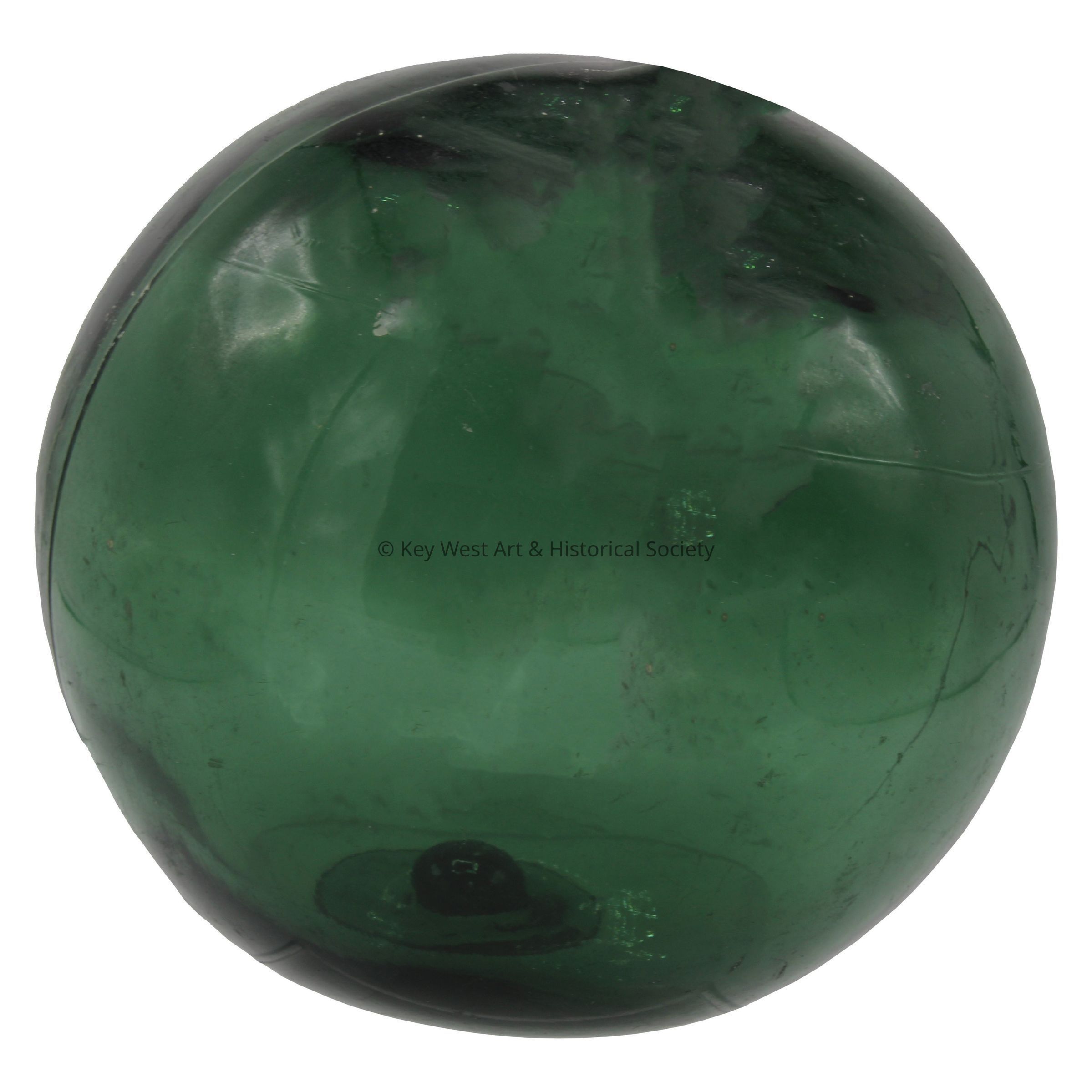 Blue green glass fishing float that was once used by fishermen to keep their lines afloat.