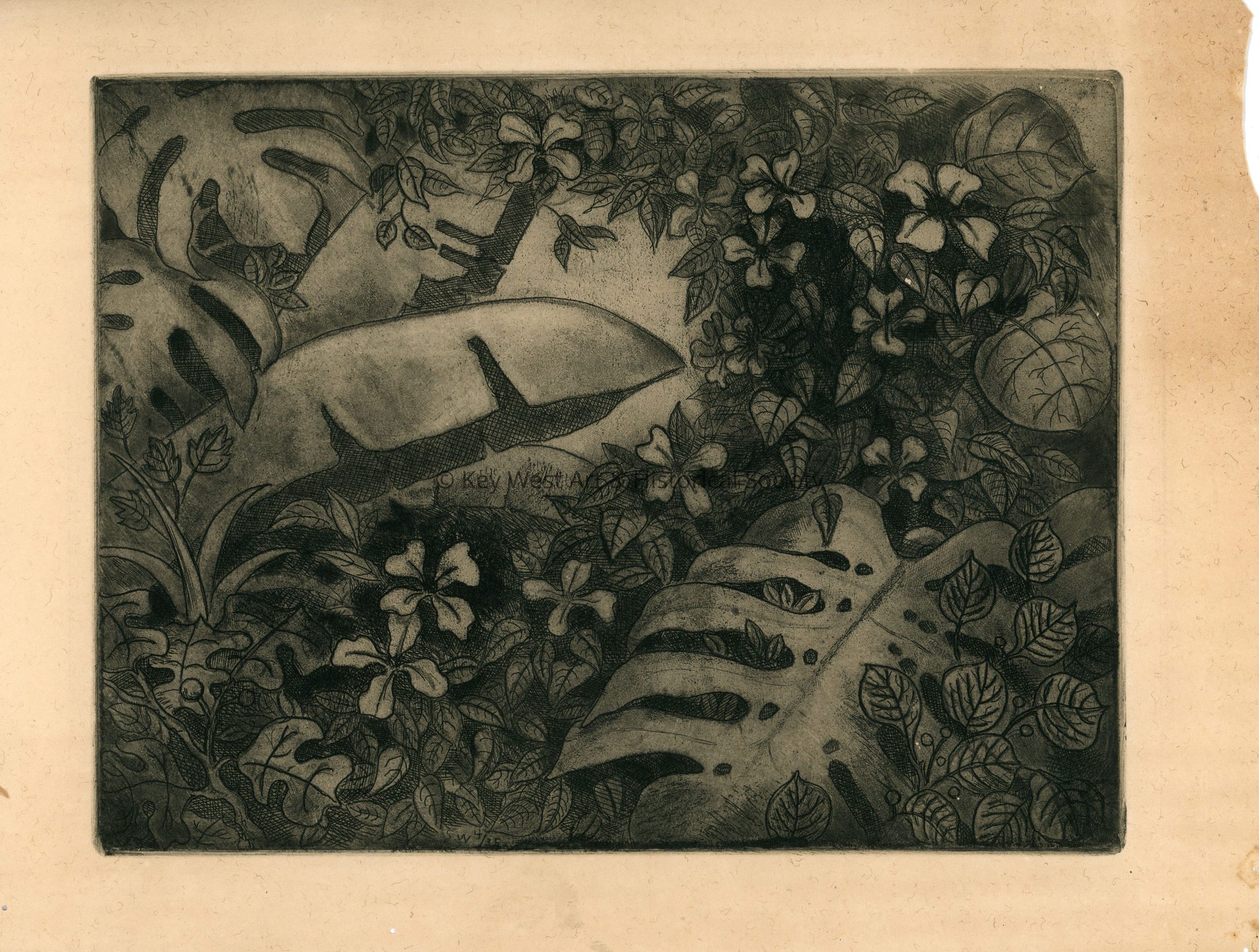 Etching by Stanley Wood depicting lush tropical foliage.: © Key West Art & Historical Society