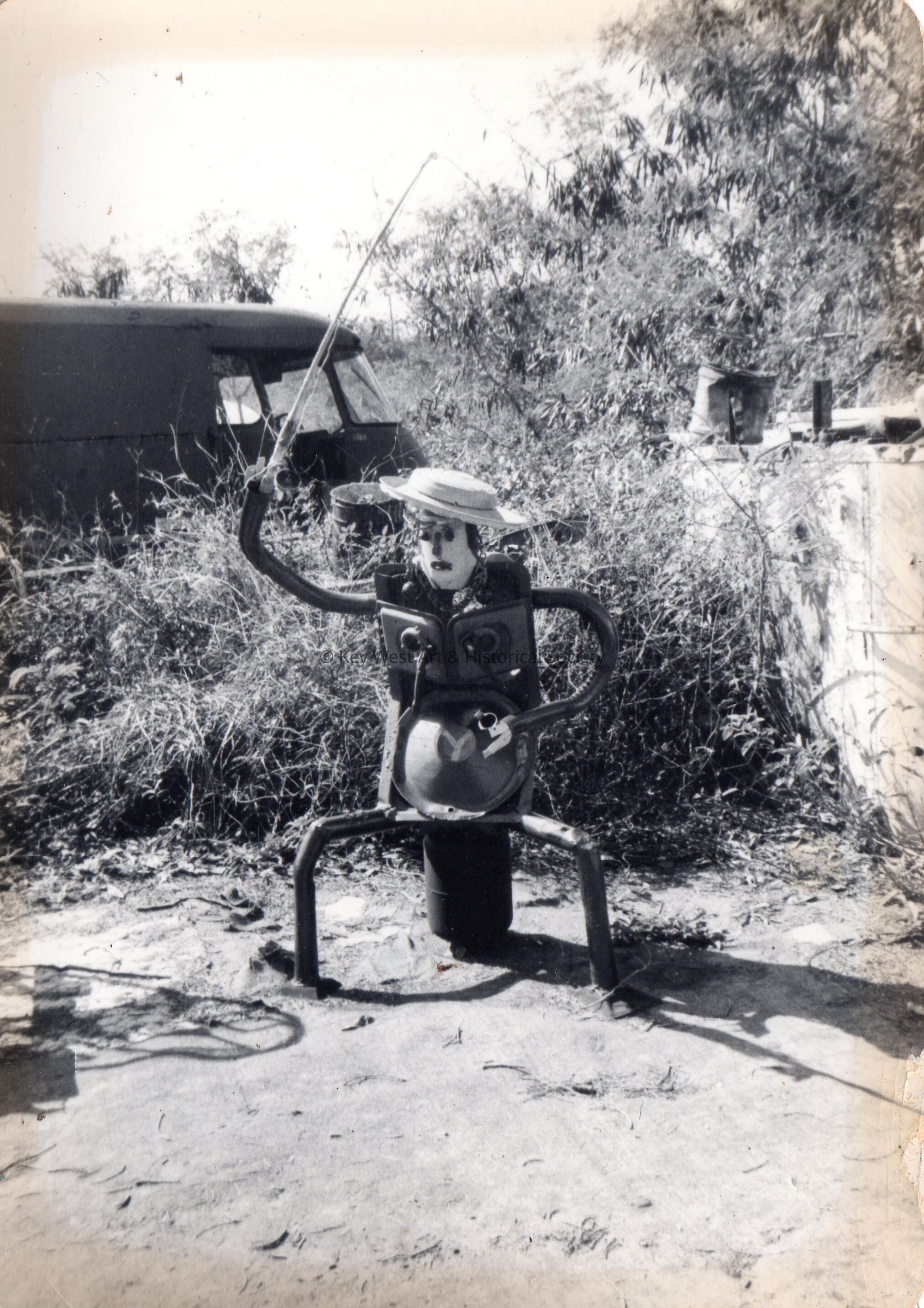 Black and white photograph of a Stanley Papio metal sculpture named Dish Pan Annie taken on his property in Key Largo.