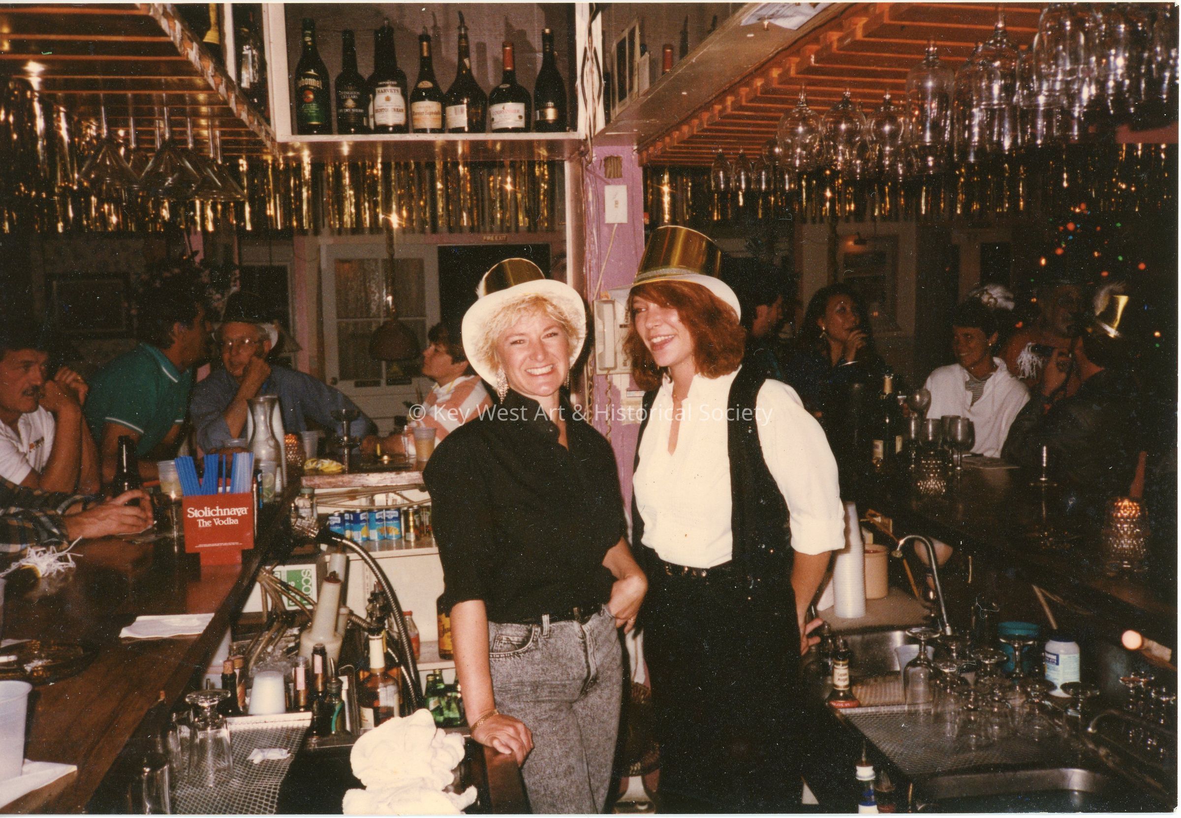 Two (2) people behind the bar wearing New Years hats at what is ostensibly the Pigeon House Patio Restaurant and Bar formerly located at 301 Whitehead Street.