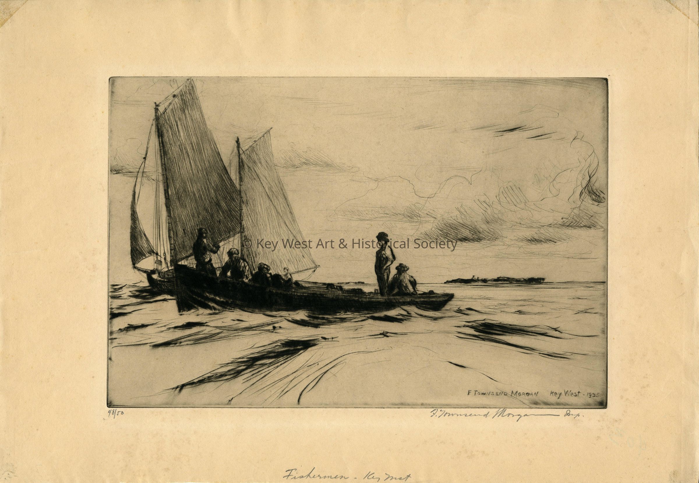 Lithograph by F. Townsend Morgan depicting fishermen in two sailboats. Numbered 48/50.